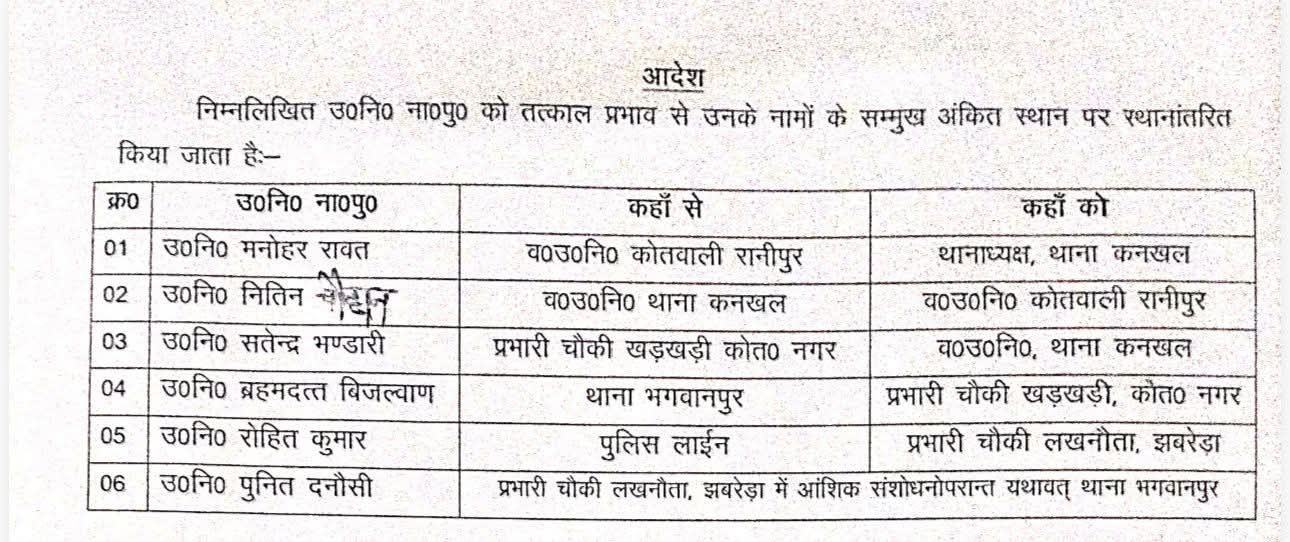एस एस पी हरिद्वार प्रमेंद्र सिंह डोबाल ने देर रात 06 दारोगाओं को किया स्थानांतरित ,कनखल थाने के प्रभारी और एक एस आई को लाइन हाजिर किया।