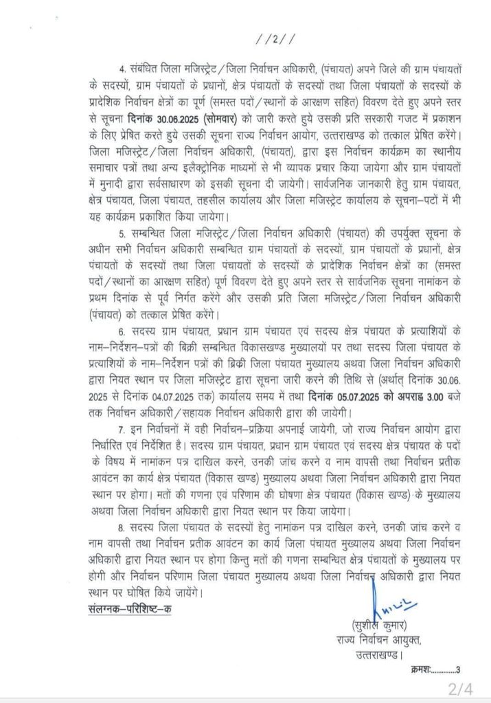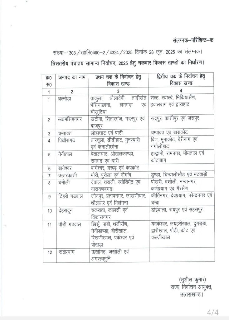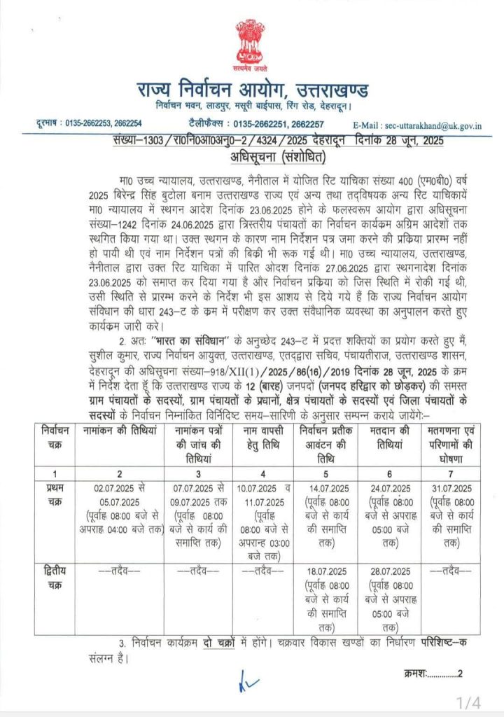 उत्तराखंड पंचायत चुनाव का संशोधित कार्यक्रम जारी किया गया है,,पहले चरण के तहत 24 जुलाई कों होगा मतदान, दूसरे चरण के तहत 28 जुलाई को होगा मतदान।