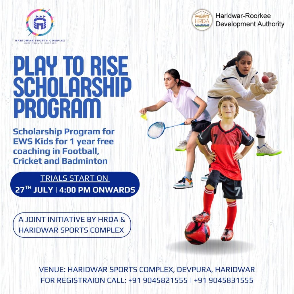हरिद्वार स्पोर्ट्स कॉम्प्लेक्स और हरिद्वार-रुड़की विकास प्राधिकरण (HRDA) द्वारा आर्थिक रूप से कमजोर वर्ग (EWS) के बच्चों के लिए “प्ले टू राइज़” स्कॉलरशिप प्रोग्राम शुरू किया गया है। इस योजना के तहत बच्चों को फुटबॉल, क्रिकेट और बैडमिंटन की एक वर्ष तक मुफ्त कोचिंग दी जाएगी।