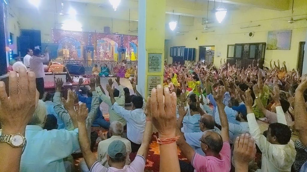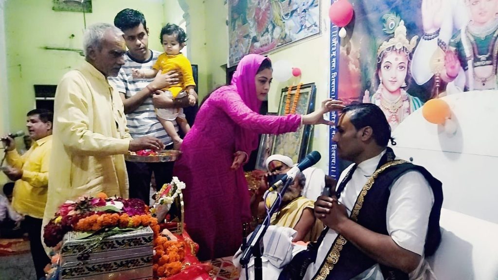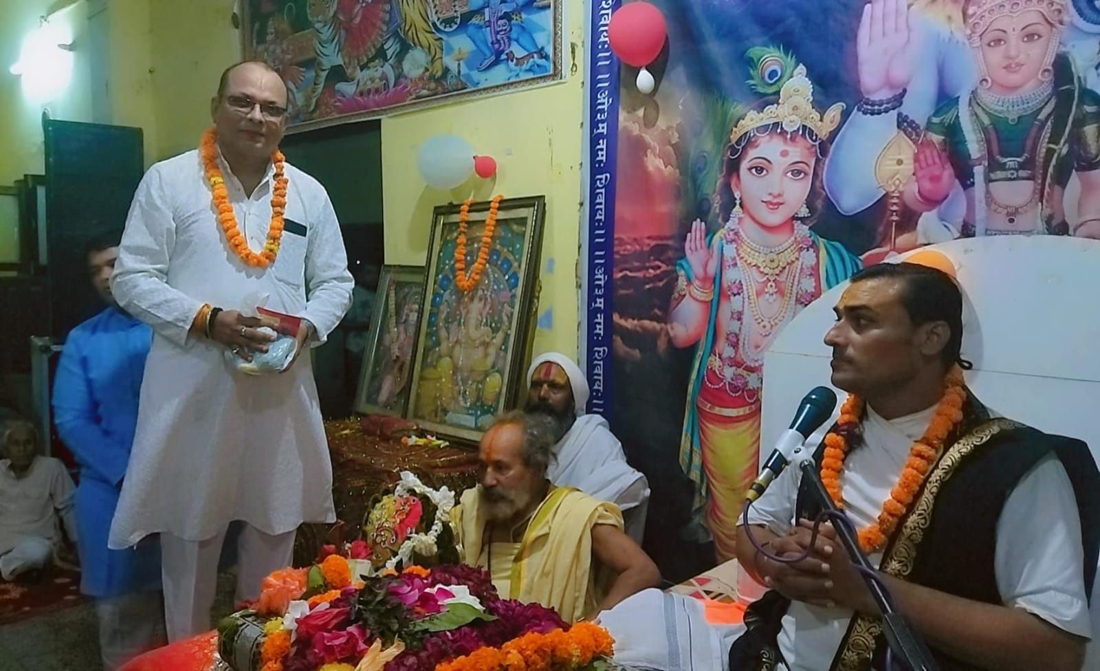 कथा मे मंदिर सचिव ब्रिजेश शर्मा और कथा के मुख्य यजमान प्रभात गुप्ता और उनकी धर्मपत्नी रेनू गुप्ता,