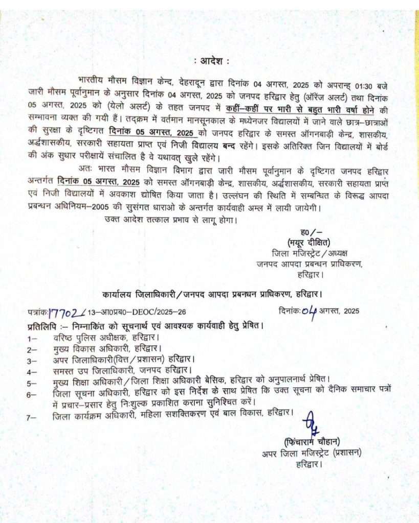 जिला मजिस्ट्रेट एवं जिलाधिकारी मयूर दीक्षित ने बताया कि भारतीय मौसम विज्ञान केन्द, देहरादून द्वारा दिनांक 04 अगस्त, 2025 को अपरान्ह 01:30 बजे जारी मौसम पूर्वानुमान के अनुसार दिनांक 04 अगस्त, 2025 को जनपद हरिद्वार हेतु (ऑरेंज अलर्ट) तथा दिनांक 05 अगस्त 2025 को (येलो अलर्ट) के तहत जनपद में कहीं-कहीं पर भारी से बहुत भारी वर्षा होने की सम्भावना व्यक्त की गयी हैं। तद्क्रम में वर्तमान मानसूनकाल के मध्येनजर विद्यालयों में जाने वाले छात्र-छात्राओं की सुरक्षा के दृष्टिगत दिनांक 05 अगस्त, 2025 को जनपद हरिद्वार के समस्त ऑगनबाड़ी केन्द्र, शासकीय, अर्द्धशासकीय, सरकारी सहायता प्राप्त एवं निजी विद्यालय बन्द रहेंगे। इसके अतिरिक्त जिन विद्यालयों में बोर्ड की अंक सुधार परीक्षायें संचालित है ये यथावत् खुले रहेंगे।