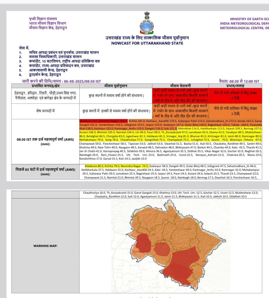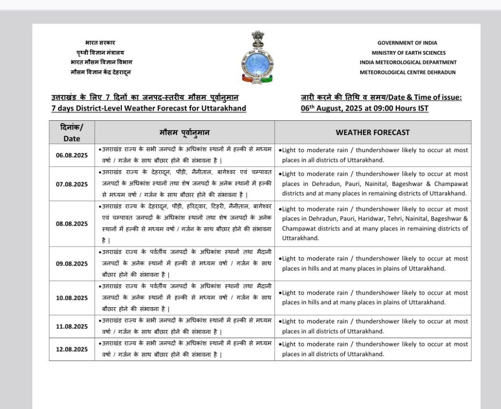 पूरे उत्तराखंड में आज भी भारी बारिश का अनुमान है मौसम विभाग ने 5 दिन का पूरा अनुमान जारी करते हुए आज के लिए पूरे प्रदेश में मौसम का रेड अलर्ट जारी किया है जिसके अनुसार प्रदेश के सभी जिलों में भारी वर्षा होने की संभावना व्यक्त की गई है पूरा अनुमान के आधार पर प्रदेश के हरिद्वार देहरादून सहित कई जनपदों में स्कूलों का अवकाश भी घोषित कर दिया गया है जिला प्रशासन द्वारा चेतावनी भी जारी की जा रही है ।