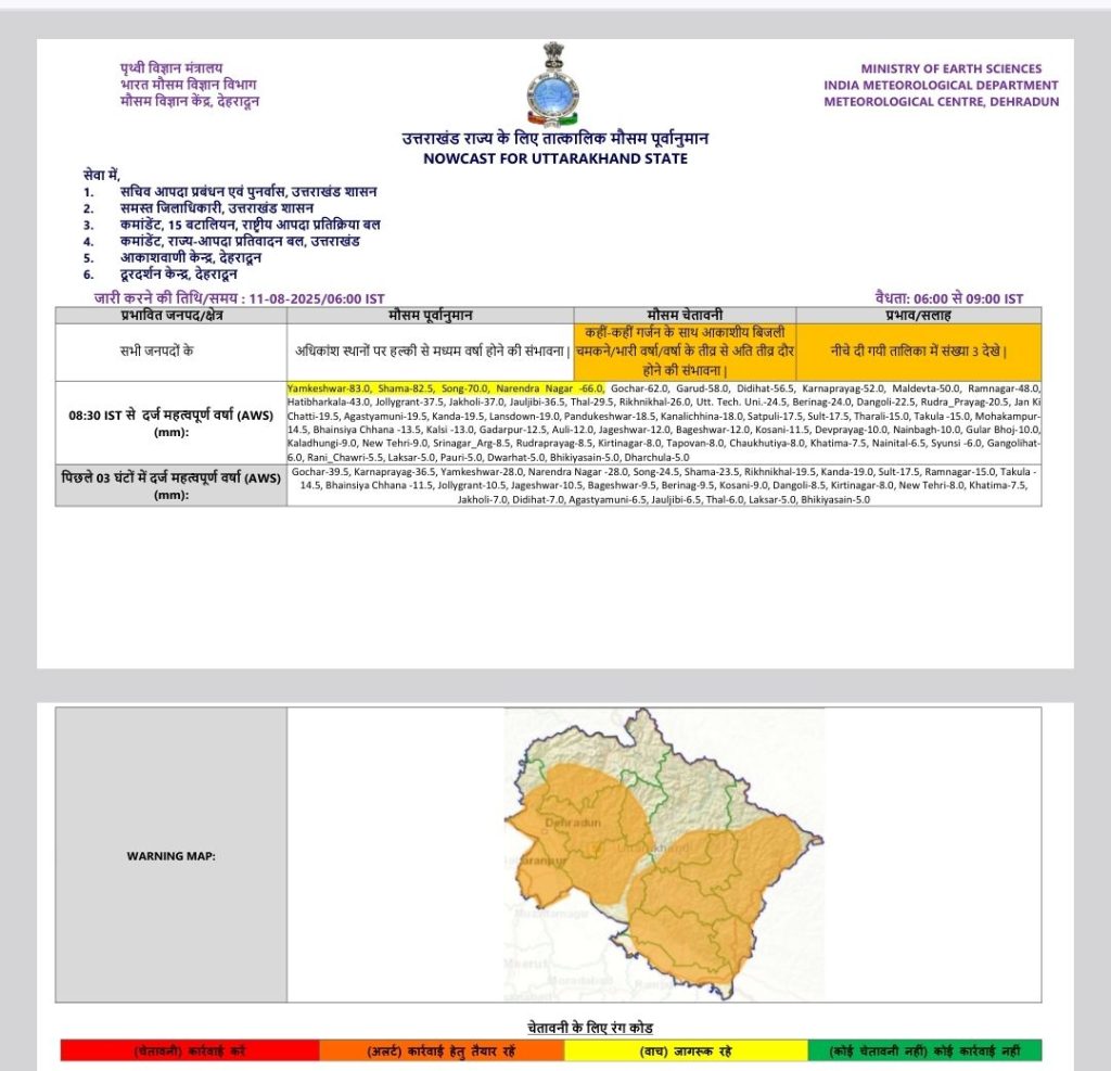 बीती रात पूरे उत्तराखंड में अनेक स्थान पर जमकर बारिश हुई, हरिद्वार में पिछले 24 घंटों में सर्वाधिक वर्षा रिकॉर्ड की गई है।आगामी चार-पांच दिन दिन भी बारिश की दौर चलने की संभावना है। देहरादून स्थित मौसम विज्ञान केंद्र के अनुसार आज 11 अगस्त को हरिद्वार ,देहरादून ,टिहरी, पौड़ी ,उधम सिंह नगर, नैनीताल, चंपावत जिलों में मौसम का ऑरेंज अलर्ट जारी किया गया है जबकि शेष जनपदों में येलो अलर्ट जारी किया गया है इसलिए पूरे प्रदेश में कहीं माध्यम और कहीं भारी वर्षा होने की संभावना व्यक्त की गई है। 13 और 14 अगस्त को भी प्रदेश के कई जनपदों में मौसम का ऑरेंज और रेड अलर्ट जारी किया गया है। मौसम विभाग के अनुसार पिछले 24 घंटे में हरिद्वार में 242 मिलीमीटर वर्षा रिकॉर्ड की गई है जो पूरे प्रदेश में सर्वाधिक है। इसके अलावा टिहरी, चमोली और देहरादून जनपदों में भी भारी वर्षा हुई है। उत्तराखंड के अनेक पर्वतीय स्थान पर यातायात सेवाएं प्रभावित हैं और इस बारिश के दौर से मुश्किलें और बढ़ने की संभावना है ।मौसम विभाग द्वारा चेतावनी जारी करते हुए लोगों को नदी नालों के किनारो से दूर रहने की सलाह दी गई है।