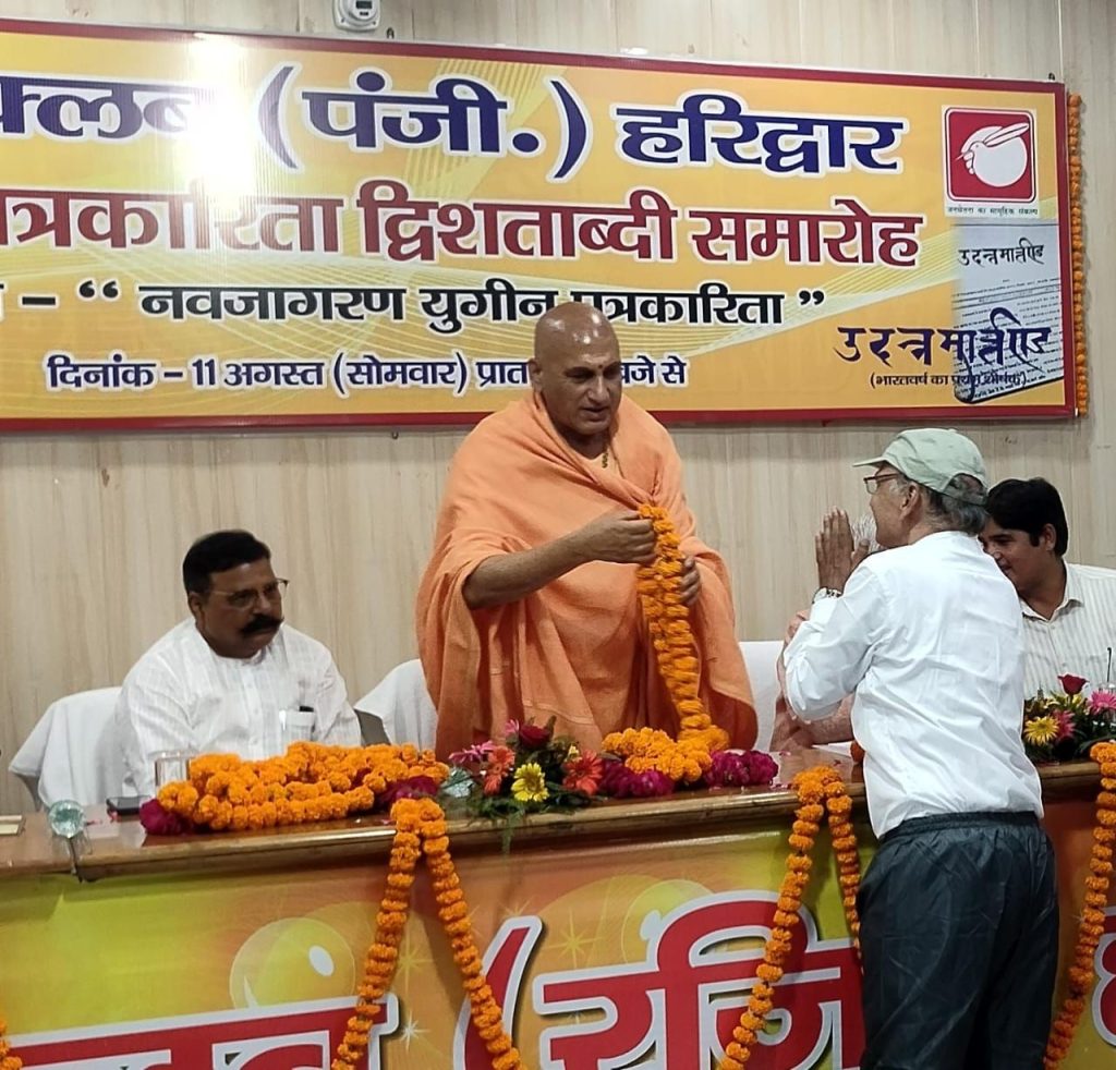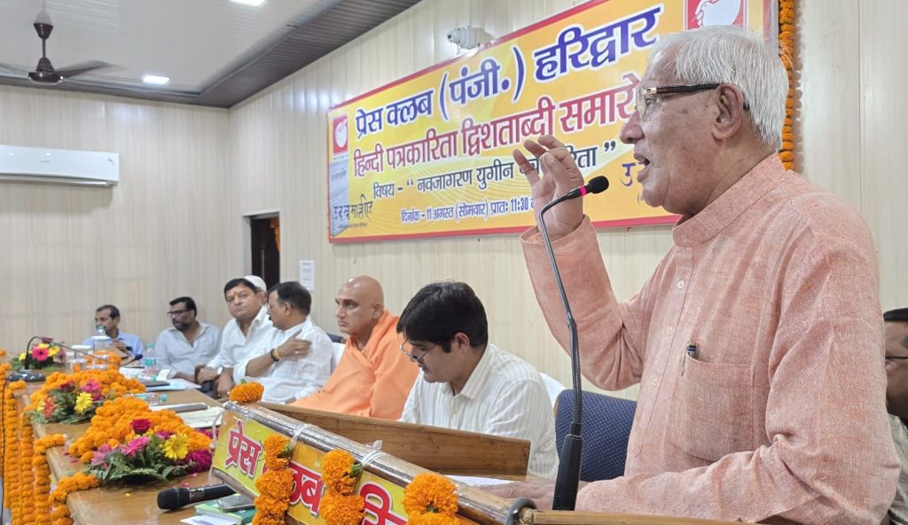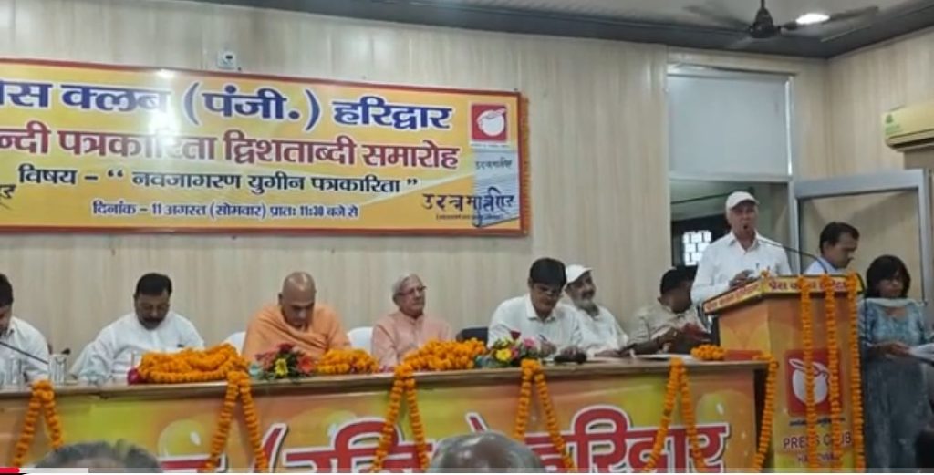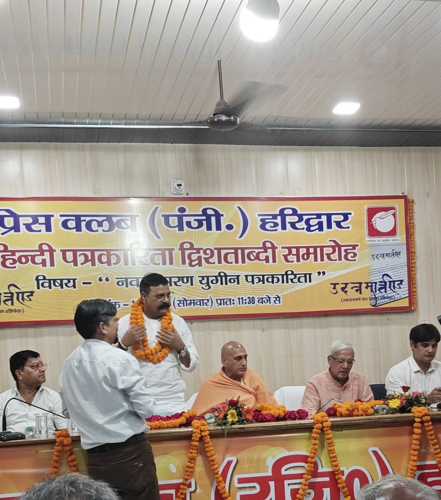 पत्रकारों की सम्मानित संस्था प्रेस क्लब (रजि.) हरिद्वार के सभागार में हिंदी द्वि-शताब्दी समारोह का शुभारंभ शानदार अंदाज में किया गया। कार्यक्रम का शुभारंभ दीप प्रज्वलन के साथ किया गया। कार्यक्रम में मुख्य वक्ता के तौर पर उपस्थित माधवराव सप्रे संग्रहालय भोपाल के संस्थापक विजयदत्त श्रीधर ने हिंदी पत्रकारिता के 200 वर्षों की यात्रा का बखूबी चित्रण करते हुए कहा कि पूरे भारतवर्ष में हिंदी पत्रकारिता के 200 वर्ष पूर्ण करने के उपलक्ष्य में व्याख्यान माला आयोजित करने वाला प्रेस क्लब हरिद्वार पहला संगठन है। इसके लिए प्रेस क्लब अध्यक्ष महासचिव संयोजक मंडल सहित सभी सदस्यों को साधुवाद देते हैं। उन्होंने कहा कहा पूरे भारत वर्ष में इस प्रकार के कार्यक्रम आयोजित करने के लिए प्रेस क्लब हरिद्वार से प्रेरणा लेनी चाहिए। विजय दत्त श्रीधर ने कहा कि पत्रकारिता में दो प्रकार के शास्वत सत्य है। पहला नारद संचालक, जों लोक-मंगल की कामना से सूचनाओं का संप्रेषण करते हैं और दूसरा पौराणिक आख्यान महाभारत से है जहां नेत्रहीन धृतराष्ट्र को संजय कुरूक्षेत्र का हाल सुनाते हैं। उन्होंने कहा फेंक न्यूज की शुरुआत महाभारत काल से हुई। जब द्रोणाचार्य को युद्ध से अलग करने के लिए धर्मराज युधिष्ठिर से झूठ बुलवाया गया। उन्होंने कहा फेक न्यूज लोकतंत्र के लिए भारी खतरा है। कानूनी तरीके से इसे रोकना संभव नहीं है। इसके वरिष्ठ पत्रकारों को भावी पीढ़ी को संस्कारित शिक्षा देनी होगी। मुख्य अतिथि के तौर पर एनयूजे, आई के राष्ट्रीय अध्यक्ष रास बिहारी ने कहा समय के पत्रकारिता के स्तर में भारी बदलाव आया है। वर्तमान में पत्रकारों की आजादी पर अंकुश लगा है। एक समय था जब पत्रकारिता ने अंग्रेजो को उखाड़ने का मंत्र दिया था। आज पुंजीपतिऔर उद्योगपति और सरकार के हाथ में सिमट कर रह गई है। कार्यक्रम के मुख्य संयोजक सुनील दत्त पांडे ने बताया कि हिंदी द्विशताब्दी समारोह में पूरे वर्ष में पांच कार्यक्रम आयोजित किए जाएंगे।
