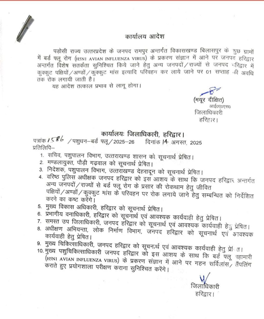 जिला मजिस्ट्रेट एवम् जिलाधिकारी मयूर दीक्षित ने जानकारी देते हुए बताया कि पड़ोसी राज्य उत्तर प्रदेश के जनपद रामपुर अन्तर्गत विकासखण्ड बिलासपुर के कुछ ग्रामों में बर्ड फ्लू रोग (HSNI AVIAN INFLUENZA VIRUS) के प्रकरण संज्ञान में आने पर जनपद हरिद्वार अन्तर्गत विशेष सतर्कता सुनिश्चित किये जाने हेतु अन्य जनपदों / राज्यों से जनपद भरिद्वार में कुक्कुट पक्षियों/अण्डों / कुक्कुट मांस इत्यादि परिवहन कर लाये जाने पर 01 सप्ताह की अवधि तक रोक लगायी जाती है। यह आदेश तत्काल प्रभाव से लागू रहेगा।