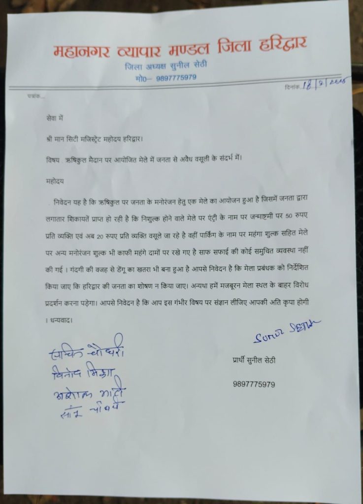 जब बड़े मॉल में एंट्री फीस नहीं तो आम इंसान के लिए आयोजित ओपन मेले में किस बात की एंट्री फीस अनावश्यक शुल्क। महानगर व्यापार मंडल के जिला अध्यक्ष सुनील सेठी ने ऋषिकुल पर आयोजित मेले की अव्यवस्थाएं जनता के शोषण पर नाराजगी जताते हुए सिटी मजिस्ट्रेट को ज्ञापन सौंप कार्यवाही की मांग की। सुनील सेठी ने बताया कि ऋषिकुल की जमीन एक ऐसी धार्मिक जनहित उपयोगी जमीन है जिस पर अच्छे अच्छे कार्य कर जनता को उसका लाभ मिले लेकिन दुर्भाग्य कुछ वर्षों से यहां लगने वाले सभी मेलो ने इस जमीन को अपनी कमाई का जरिया बना दिया जिससे इस भूमि उपयोग की मान्यता पर प्रश्न चिन्ह लगा दिया । जिसका उदाहरण ऋषिकुल में इस समय आयोजित मेला जो अव्यवस्थाओं सहित जनता के शोषण का ताजा मामला है जिसमें एंट्री फीस के नाम पर जन्माष्टमी पर लाखों रुपए वसूले गए महंगी दोपहिया, चार पहिया वाहन पार्किंग जो अब भी जारी है उसके साथ सुरक्षा के मानक पूरे नहीं झूलो पर बिठाने से टिकट काउंटर तक बिना सत्यापित आम नागरिकों से दुर्व्यवहार वाले कर्मचारी उपस्थित है साफ सफाई की समुचित व्यवस्था नहीं है आगे डेंगू फैलने का खतरा सिर पर खड़ा है समुचित सफाई व्यवस्था कीटनाशक छिड़काव के अभाव में आम नागरिकों के स्वास्थ्य से खिलवाड़ किया जा रहा है अनावश्यक महंगे चार्ज लगा मनोरंजन के नाम पर आम इंसान का शोषण किया जा रहा है। खाने पीने के सामान पर कोई फूड लाइसेंस एवं सामग्री की शुद्धता की जांच भी बड़ा विषय है। सामाजिक कार्यकर्ता विनोद मिश्रा एवं सचिन चौधरी ने कहा कि कुल मिलाकर हरिद्वार के नागरिकों का उत्पीड़न शोषण करने का मेला आयोजन कमेटी कार्य कर रही है जिससे हरिद्वार की मर्यादा भी भंग हो रही है और यहां के नागरिक का शोषण भी जिस पर सख्त कार्यवाही करते हुए मेले के सभी मानक पूरे किए जाए एवं जिला अधिकारी महोदय से मांग है कि एंट्री फीस पर भी रोक लगवाई जाए। शुरू के दो दिन जन्माष्टमी सहित जो अवैध वसूली एंट्री फीस के नाम पर की गई है उसकी प्रशाशन द्वारा रिकवरी कर जनहित में लगाई जाए। जनता के पैसे का सदुपयोग किया जाए जो जनता के काम आए। पूर्व पार्षद प्रीत कमल सारस्वत एवं युवराज बिष्ट ने कहा कि मेले के हर झूले हर मनोरंजन कार्य के रेट उचित रखे जाए जिससे एक आम इंसान भी अपने बच्चों को मेला घुमा सके । हर झूले हर मनोरंजन के रेट चस्पा किए जाए साथ ही बच्चों की सुरक्षात्मक सभी ठोस उपाय मानक पूरे किए जाए फायर बिग्रेड की दो गाड़ी इंतजाम मेला कमेटी द्वारा अनिवार्य रूप से किया जाए। सुनील सेठी ने कहा कि ऐसे लगाने वाले आयोजनों पर हरिद्वार की इस भूमि की मर्यादा एवं गरिमा आयोजक मंडल द्वारा रखी जाए एवं आम इंसान की आर्थिक स्थिति के हिसाब से मानक तय किए जाए। मुख्य रूप से महानगर व्यापार म
