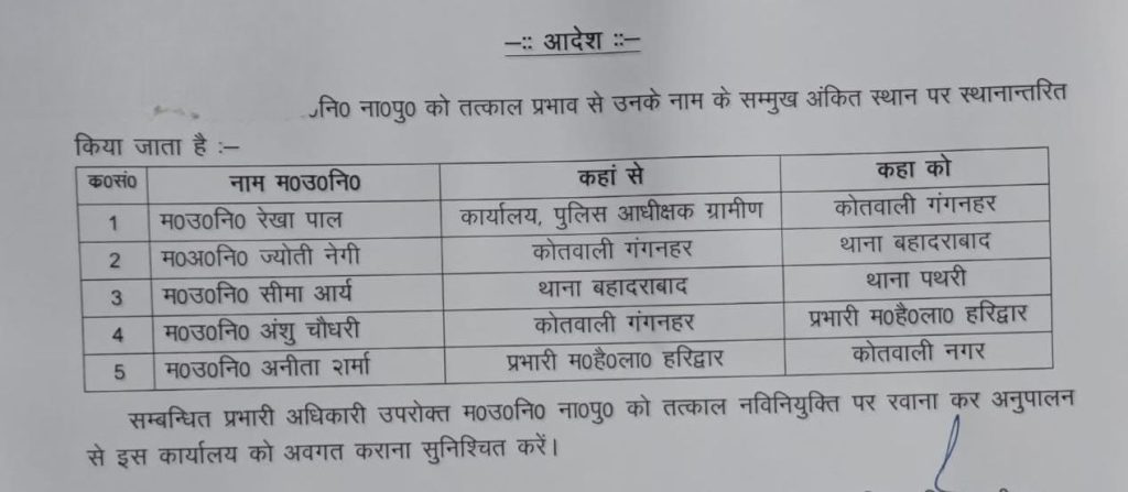आज मंगलवार को हरिद्वार एसएसपी प्रमेंद्र डोबाल ने महिला दारोगाओं के तबादला किए है। जिनमें एसपी देहात कार्यालय से एसआई रेखा पाल को कोतवाली गंगनहर, गंगनहर से एसआई ज्योति नेगी को थाना बहादराबाद, थाना बहादराबाद से सीमा आर्य को थाना पथरी, गंगनहर से अंशु चौधरी को प्रभारी महिला हेल्प लाइन हरिद्वार भेजा है, जबकि यहां से प्रभारी अनीता शर्मा को कोतवाली नगर भेजा है।