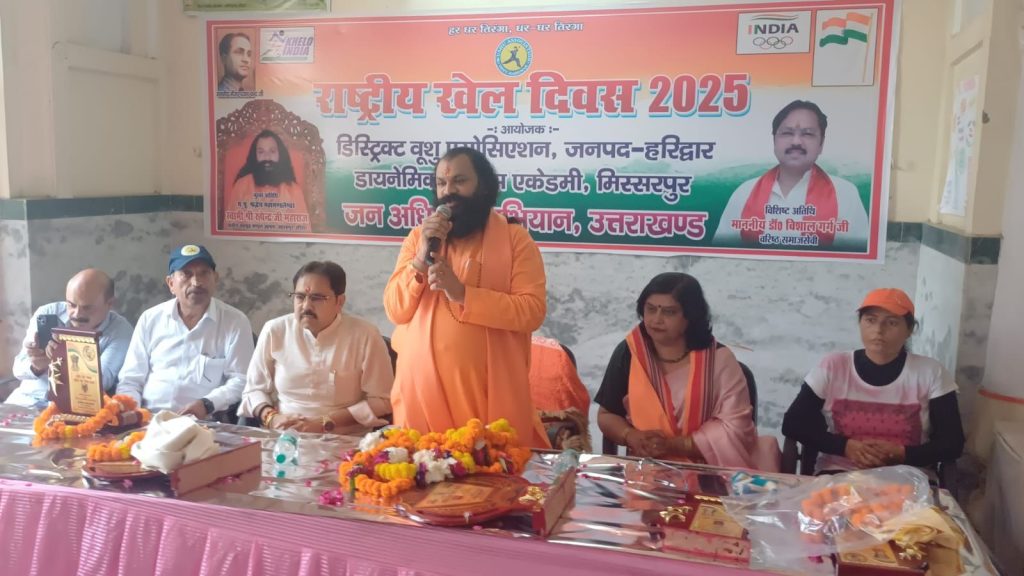 राष्ट्रीय खेल दिवस की पूर्व संध्या पर श्री मिथिलेश सनातन धर्म इंटर कालेज, सतीघाट कनखल में एक भव्य और दिव्य समारोह का आयोजन किया गया। डिस्ट्रिक्ट वूशु एसोसिएशन जनपद हरिद्वार और डायनेमिक स्पोर्ट्स क्लब मिस्सरपुर एवं जन अधिकार अभियान संस्था द्वारा संयुक्त रूप से यह आयोजन किया गया। कार्यक्रम का शुभारंभ मुख्य अतिथियों द्वारा दीप प्रज्वलित कर और मां सरस्वती के चित्र एवं श्री सनातन धर्म प्रतिनिधि सभा (पंजाब) नई दिल्ली के संस्थापक त्याग मूर्ति गोस्वामी गणेश जी की प्रतिमा पर माल्यार्पण कर किया गया।