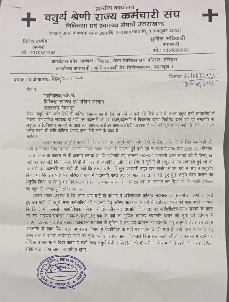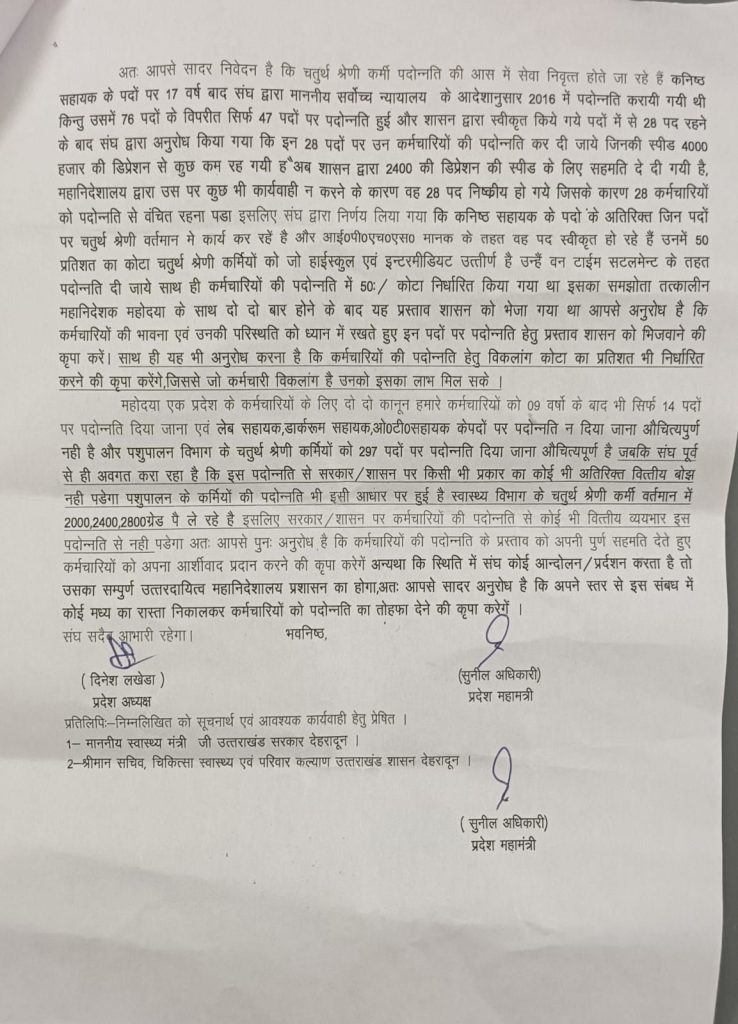 प्रदेश अध्यक्ष दिनेश लखेड़ा प्रदेश महामंत्री सुनील अधिकारी प्रदेश उपाध्यक्ष नेल्सन अरोड़ा प्रदेश संगठन सचिव दिनेश गोसाईं, सुरेन्द्र सिंह ने कहा कि संगठन ने पिछले तीन साल में महानिदेशक, निदेशक महोदय से तीन समझौता वार्ता की गई किंतु अभी तक कोई भी ठोस प्रस्ताव बनकर शासन को नहीं पहुंचा है क्योंकि लिपिक संवर्ग में पदोन्नति की पद कम होने के कारण कर्मचारियों में आक्रोश व्याप्त है इसलिए ही महानिदेशालय के वरिष्ठ अधिकारियों के प्रस्ताव देने पर कि जो कर्मचारी हाई स्कूल और इंटरमीडिएट पास है उसको आई पी एच एस मानकों में लेब सहायक, डॉर्करुम सहायक, ओटी सहायक के पदों को सृजित करा कर और जो पद वर्तमान में सृजित हैं उन पर 50%कोटे के तहत आपकी पदोन्नति कर दी जाएगी किंतु अभी तक कोई पदोन्नति नहीं हुई है।