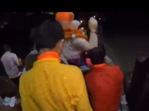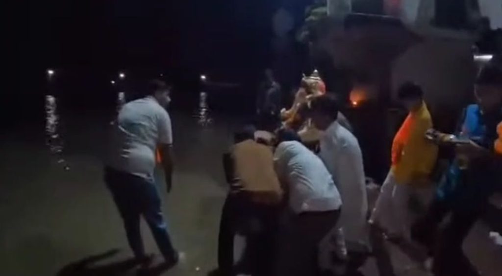 हरिद्वार के कनखल क्षेत्र में गणेश जी की मूर्ति के विसर्जन के दौरान एक दुखद हादसा में एक युवक गंगा की तेज धारा में बह गया। सूचना पर पहुंची पुलिस ने युवक की तलाश की, लेकिन अंधेरा होने के कारण युवक का कोई सुराग नहीं मिल पाया। बुधवार सुबह फिर से सर्च अभियान शुरू किया गया है। वीडियो में देखें टोपी वाला युवक आगे बढ़ता है और अचानक संतुलन बिगड़ने से गंगा जी में गिर जाता है।