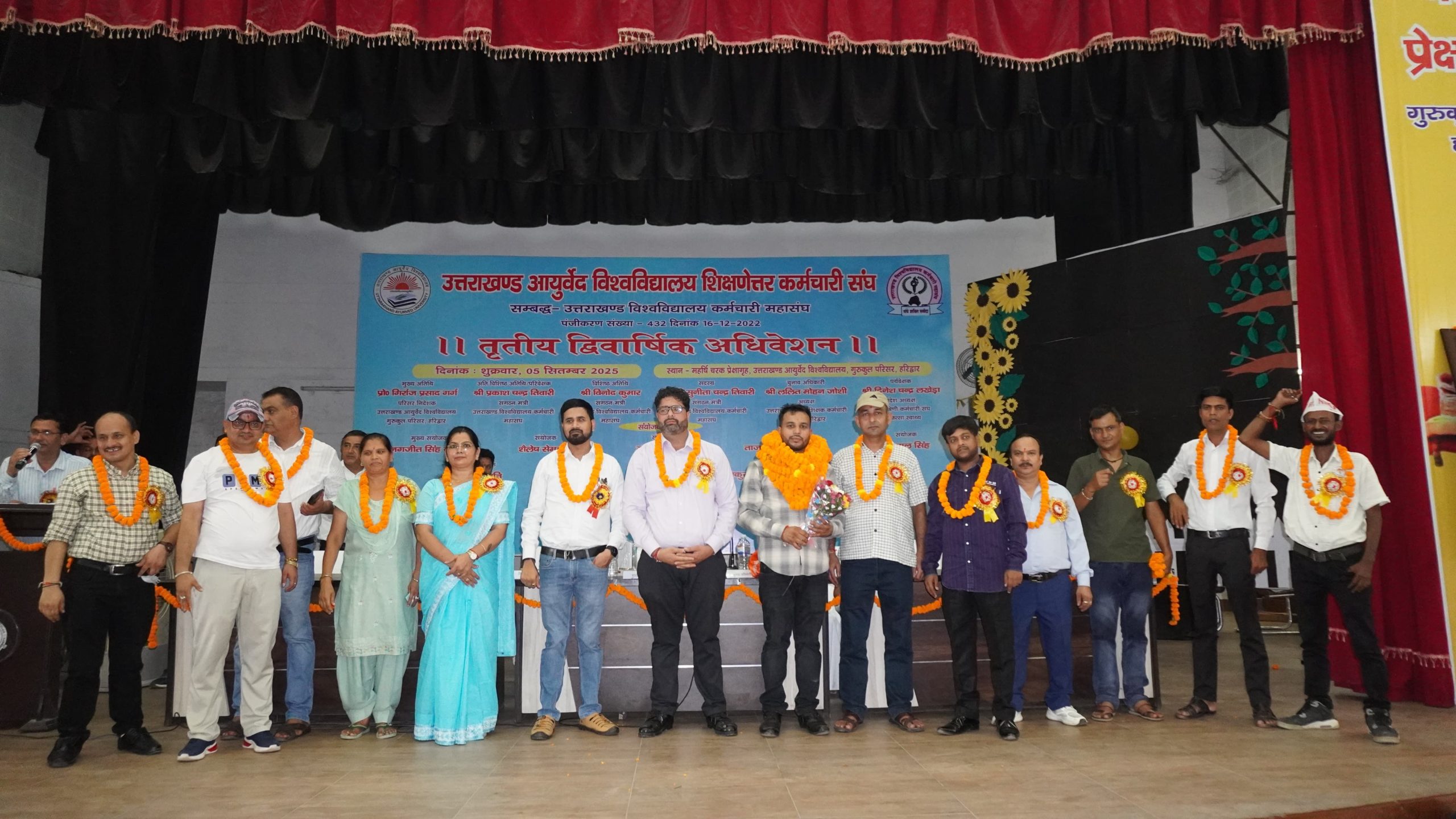 उत्तराखंड आयुर्वेद विश्वविद्यालय शिक्षणेत्तर कर्मचारी संघ का तृतीय अधिवेशन/सम्मेलन उत्तराखंड आयुर्वेद विश्वविद्यालय के गुरुकुल परिसर हरिद्वार में संपन्न हुआ, अध्यक्ष पद पर खीमानंद भट्ट, उपाध्यक्ष सुनीता चंद्र तिवारी , शैलेश सेमवाल, सचिव आशुतोष गैरोला, उप सचिव छत्रपाल,विजय कुमार, संगठन मंत्री सुमित कुमार ताजबर सिंह, विनोद कश्यप, प्रचार मंत्री/ मीडिया प्रभारी प्रबल सिंह, कोषाध्यक्ष अनिल सिंह नेगी, सह कोषाध्यक्ष बाला देवी एवं राजू , ऑडिटर मनीष पंवार सर्वसहमति से निर्विरोध चुने गए।