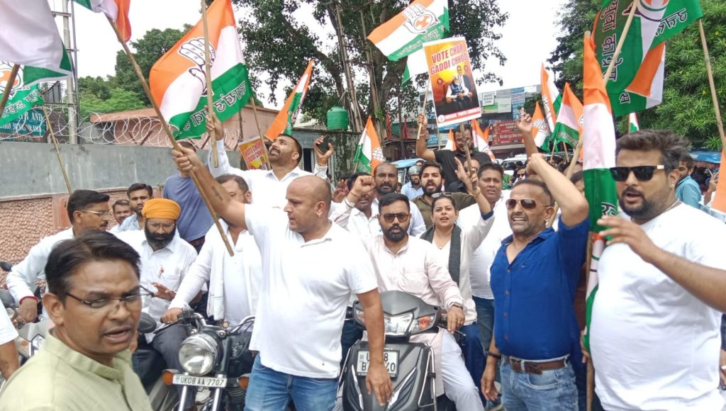 जिसमें सैकड़ों कार्यकर्ताओं के साथ प्रदेश प्रभारी सुरभी द्विवेदी, प्रदेश अध्यक्ष सुमितर भुल्लर भी शामिल रहे। इस अवसर पर प्रदेश प्रभारी सुरभी द्विवेदी ने कहा कि राहुल गांधी ने चुनाव आयोग और भाजपा के खिलाफ देश को जगाने का कार्य किया। वोट चोरी कर भाजपा अपनी सरकार बनाती है। चुनाव आयोग के साथ साथ भाजपा भी जनता की दोषी है और दोनों को देश से माफी मांगनी चाहिए। प्रदेश अध्यक्ष सुमितर भुल्लर ने कहा कि भाजपा सरकार विपक्ष और जनता की आवाज को दबाना चाहते हैं। विपक्ष बहुत मजबूत है और जनता के साथ है। जिलाध्यक्ष कैश खुराना ने कहा कि यह देश संविधान से चलता आया है और भविष्य में भी संविधान से चलेगा। संविधान ही एक आम नागरिक को सरकार चुनने का अधिकार देता है। बीएलओ ने बीजेपी के साथ मिलकर जनता के मताधिकार को छीना है। हरिद्वार में भी विधायक द्वारा वोट चोरी की गई है। बाहरी लोगों के वोट बनाए गए। स्थानीय लोगों के साथ धोखा किया गया। इस अवसर पर कांग्रेस महानगर अध्यक्ष अमन गर्ग, शहर अध्यक्ष तुषार कपिल, नितिन तेश्वर, वरुण बालियान, तरुण व्यास, दुर्गेश शर्मा, मृत्युंजय पांडे, रवि राजू, ऋषभ वशिष्ठ, राजबीर सिंह चौहान, अशोक शर्मा, सागर बेनीवाल, जितेंद्र सिंह, आशु भारद्वाज, लता जोशी, पार्षद सुनील कुमार, सोहित सेठी, हिमांशु गुप्ता, सुमित त्यागी, राजीव भार्गव, संजय कुमार, सार्थक ठाकुर, जितेंद्र सिंह, अक्षय गोदियाल, वंश, जोनी, मोहित चंचल, तनु वालिया, आशुतोष श्रीवास्तव, लक्की महाजन, मनीष गुप्ता, याज्ञिक वर्मा, जतिन हांडा, विकास चंद्रा, ओम पहलवान आदि शामिल रहे।