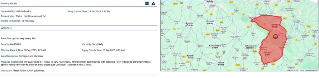 भारत मौसम विज्ञान केन्द, देहरादून द्वारा दिनांक 18 सितम्बर, 2025 को रात्रि 03:00 बजे जारी मौसम पूर्वानुमान के अनुसार दिनांक 18 सितम्बर, 2025 को जनपद हरिद्वार में मध्यम से भारी वर्षा / जल भराव / आकाशीय बिजली चनकने तथा गर्जन के साथ वर्षा (रेड अलर्ट) की सम्भावना व्यक्त की गयी है।