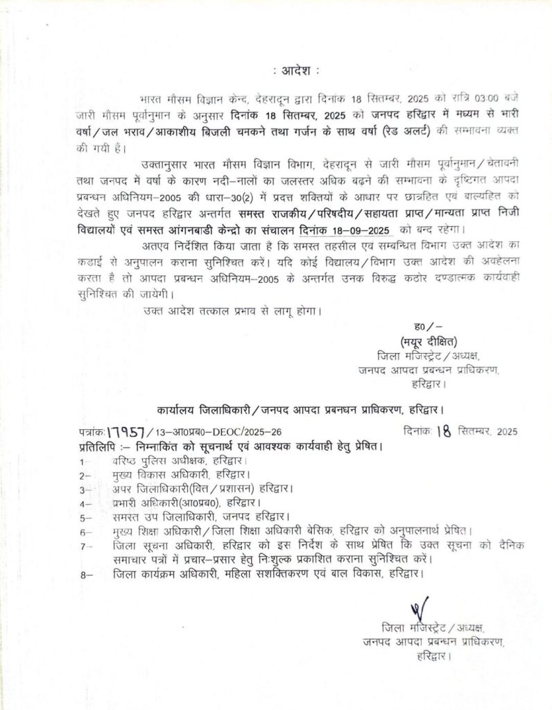 भारी वर्षा/जल भराव के दृष्टिगत हरिद्वार जनपद के सभी स्कूल/आगनबाड़ी केंद्र आज दिनांक 18.09-2025 को बंद रहेंगे । जिलाधिकारी हरिद्वार द्वारा आदेश जारी किया गया है। जिसमें कहा गया है