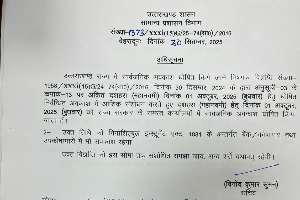 उत्तराखण्ड राज्य में सार्वजनिक अवकाश घोषित किये जाने विषयक विज्ञप्ति संख्या-1958/xxxi(15)G/24-74 (सा0) / 2016, दिनांक 30 दिसम्बर, 2024 के द्वारा अनुसूची-03 के कमांक-13 पर अंकित दशहरा (महानवमी) दिनांक 01 अक्टूबर, 2025 (बुधवार) हेतु घोषित निर्बन्धित अवकाश में आंशिक संशोधन करते हुए दशहरा (महानवमी) हेतु दिनांक 01 अक्टूबर, 2025 (बुधवार) को राज्य सरकार के समस्त कार्यालयों में सार्वजनिक अवकाश घोषित किया जाता हैं।