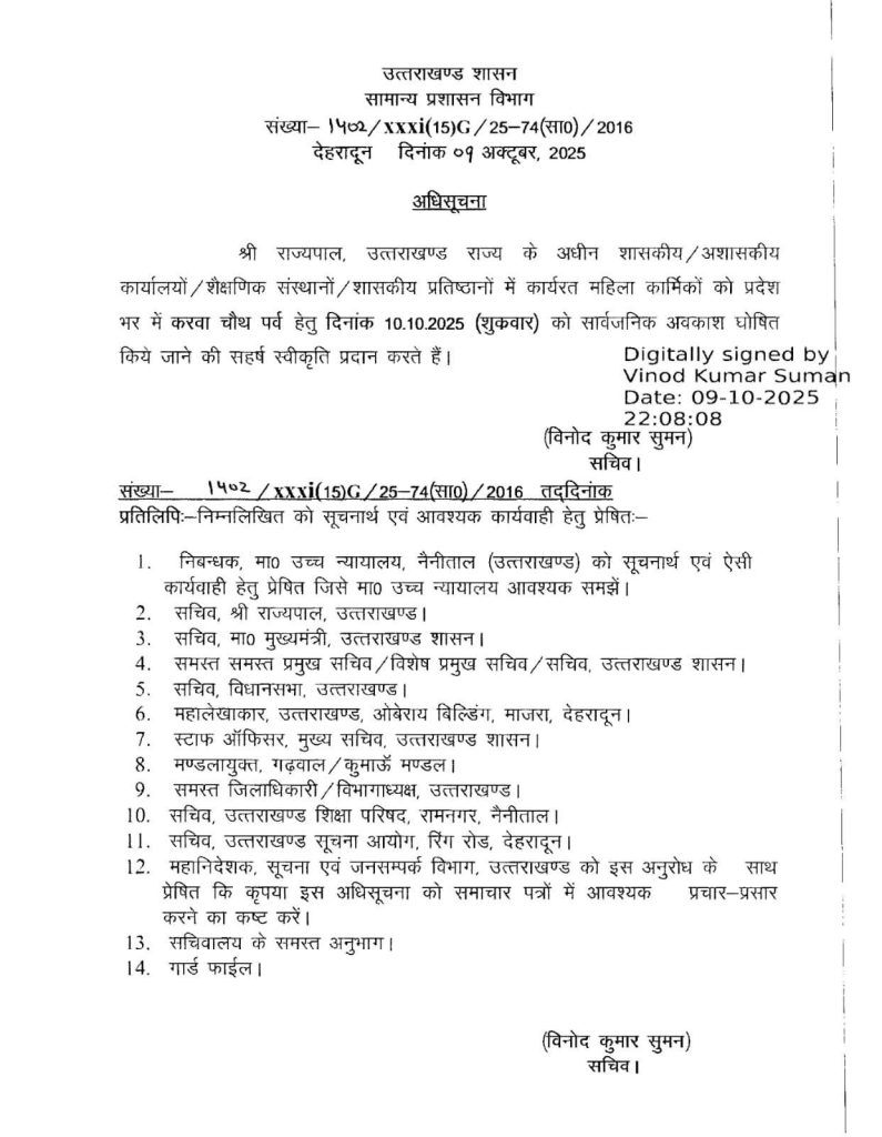 श्री राज्यपाल, उत्तराखण्ड राज्य के अधीन शासकीय/अशासकीय कार्यालयों / शैक्षणिक संस्थानों / शासकीय प्रतिष्ठानों में कार्यरत महिला कार्मिकों को प्रदेश भर में करवा चौथ पर्व हेतु दिनांक 10.10.2025 (शुक्रवार) को सार्वजनिक अवकाश घोषित किये जाने की सहर्ष स्वीकृति प्रदान करते हैं।