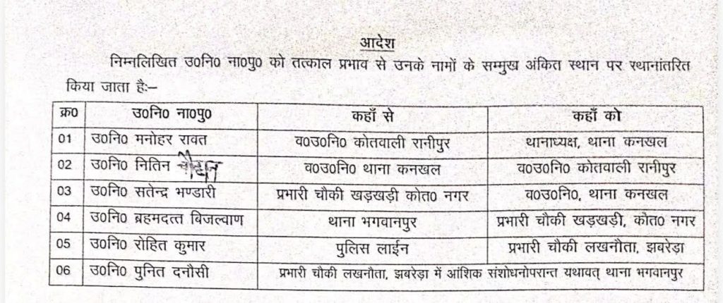 सोमवार को रात एसएसपी प्रमेंद्र सिंह डोबाल ने ट्रांसफर आदेश जारी किए। रानीपुर कोतवाली के एसएसआई मनोहर सिंह रावत को थानाध्यक्ष कनखल बनाया है। एसएसआई कनखल को नितिन बिष्ट को एसएसआई रानीपुर, खड़खड़ी चौकी प्रभारी सतेंद्र भंडारी को एसएसआई कनखल बनाया है। भगवानपुर थाने से ब्रह्मदत्त बिजल्वाण को खड़खड़ी चौकी प्रभारी, रोहित कुमार को पुलिस लाइन से लखनौता चौकी प्रभारी, पुलिस दसौनी का लखनौता चौकी प्रभारी से थाना भगवानपुर भेजा गया।
