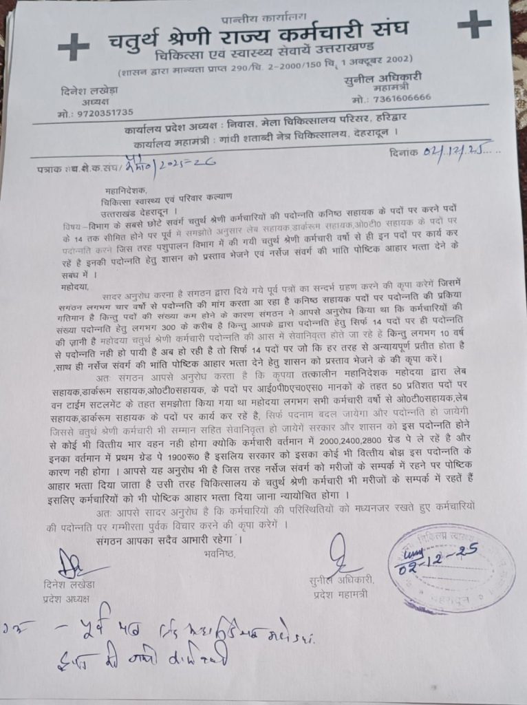 आज मंगलवार को चतुर्थ श्रेणी राज्य कर्मचारी संघ चिकित्सा स्वास्थ्य सेवाएं उत्तराखंड ने पदोन्नति और पौष्टिक आहार भत्ता को लेकर महानिदेशक कार्यालय में ज्ञापन सौंपा, महानिदेशक महोदया राजकीय कार्य से बाहर होने पर संयुक्त निदेशक डा अजीत जौहरी, डा नरेश नपच्याल से अनुरोध किया कि एक माह होने को है जो कमेटी प्रदेश से पदोन्नति के लिए आए हुए प्रपत्रों की जांच के लिए बनाई गई थी वो छुट्टी पर होने के कारण कर्मचारियों के प्रपत्रों की जांच न होने के कारण पदोन्नति में विलंब हो रहा है जिसके कारण कर्मचारियों में आक्रोश है जो कभी भी आंदोलन का रूप ले सकता है ।डा नरेश नपच्याल द्वारा उनकी स्वयं की अध्यक्षता में तत्काल कमेटी बनाने के आदेश वरिष्ठ सहायक मनोज नौटियाल को दिए गए। उनके द्वारा शीघ्र ही पदोन्नति कराने हेतु आश्वासन दिया गया।संघ द्वारा मांग की गई कि पदोन्नति के पद सिर्फ 14 हैं जबकि कर्मचारीलगभग 200 से 300 तक है ।पद कम होने के कारण महानिदेशक महोदया से पूर्व समझौते के तहत आई पी एच एस मानकों के तहत लेब सहायक, डॉर्क रुम सहायक, ओटी सहायक के पदों पर वन टाइम सेटलमेंट के तहत पदोन्नति करा दी जाए जिससे जो कर्मचारी पदोन्नति की आस में सेवानिवृत हो रहे हैं वो पदोन्नत हो सकें।