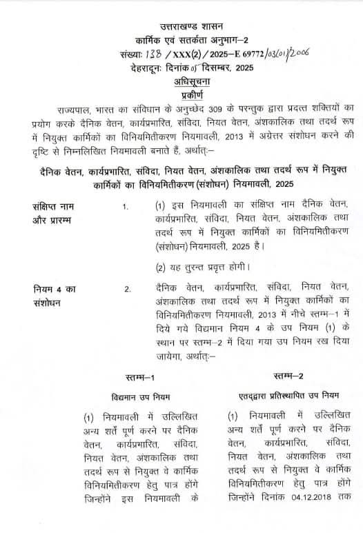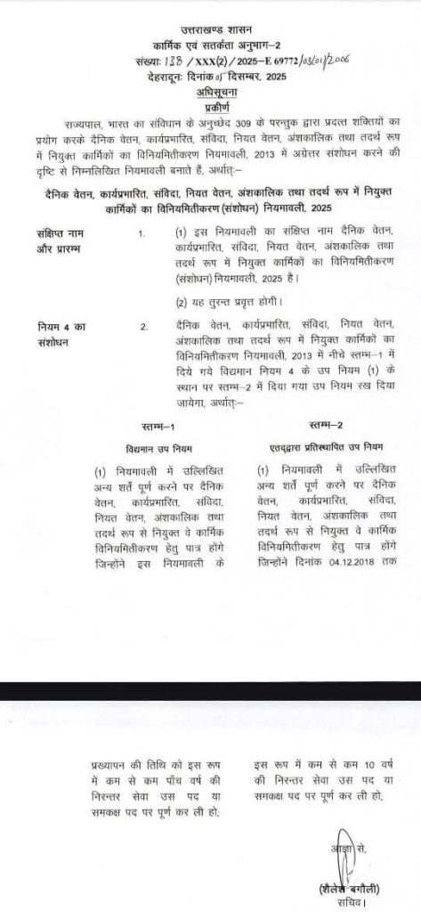 उत्तराखंड में बीते लंबे समय से लंबित पड़े मामले में आखिरकार धामी सरकार ने फैसला ले लिया है। राज्य सरकार ने महत्वपूर्ण निर्णय के क्रम में विनियमितीकरण नियमावली-2013 में संशोधन करते हुए दैनिक वेतन, कार्य प्रभारित, संविदा, नियत वेतन, अंशकालिक और तदर्थ रूप में नियुक्त कार्मिकों का संशोधित विनियमितीकरण नियमावली-2025 जारी कर दी गई है।
