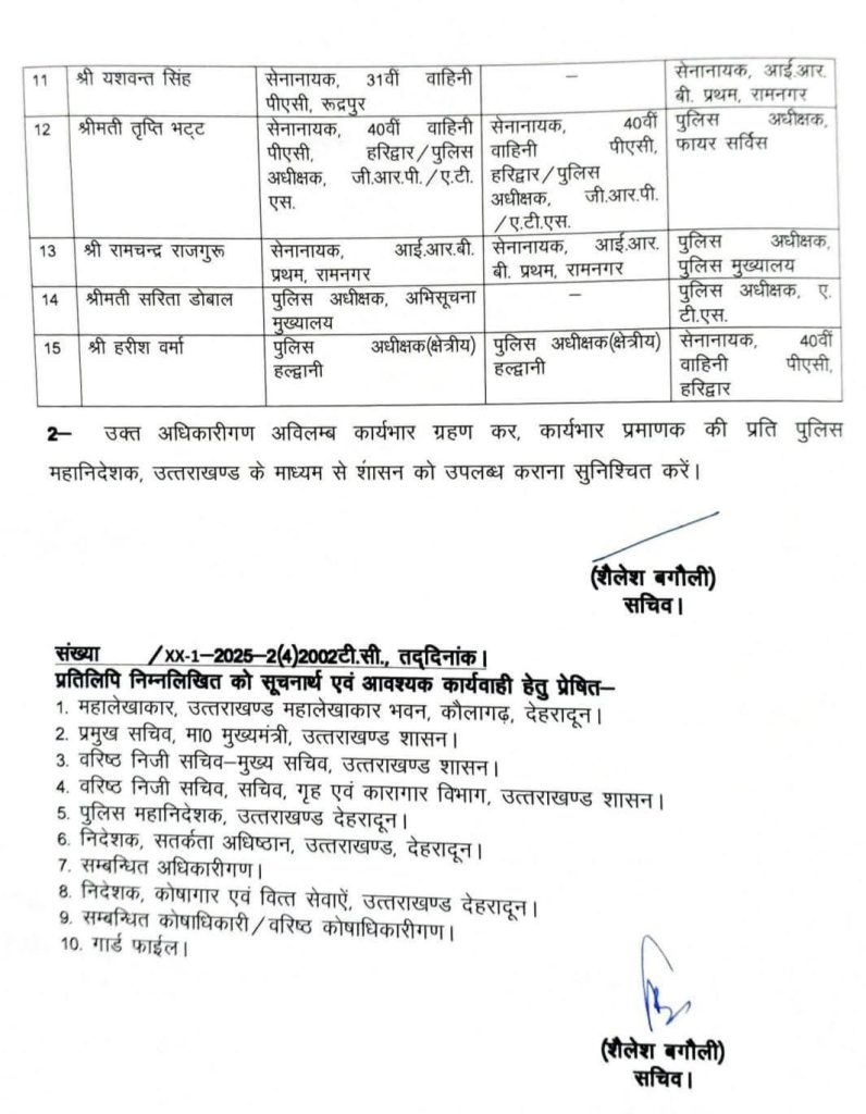 उत्तराखंड में 15 भारतीय पुलिस सेवा (IPS) के अधिकारियों को ट्रांसफर किया गया है, ट्रांसफर लिस्ट जारी की गई है देखें स्थानांतरण / तैनाती आदेश