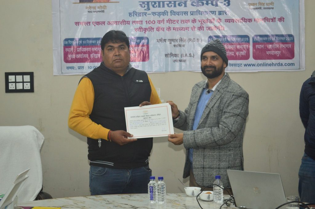 मुख्यमंत्री पुष्कर सिंह धामी के सरलीकरण, समाधान, निस्तारण एवं संतुष्टि के मंत्र को आगे बढ़ाते हुए हरिद्वार–रुड़की विकास प्राधिकरण (HRDA) द्वारा आज सुशासन कैंप का सफल आयोजन हरिद्वार रुड़की विकास प्राधिकरण, शाखा कार्यालय रुड़की के सभागार में किया गया।