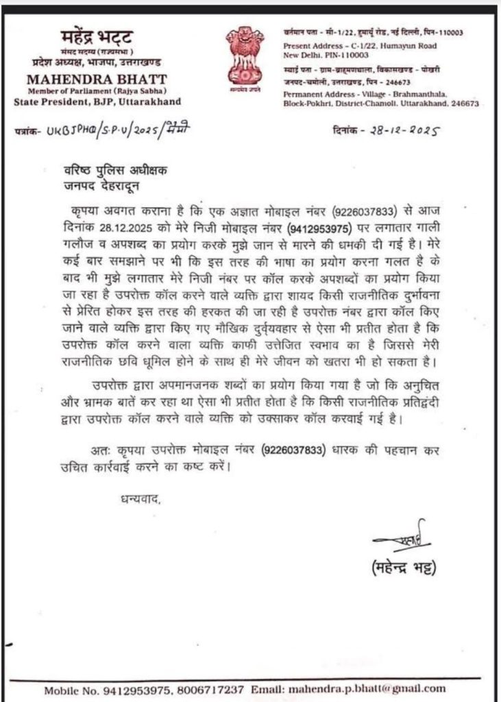 भाजपा के प्रदेशाध्यक्ष एवं राज्यसभा सांसद महेंद्र भट्ट ने एसएसपी देहरादून को शिकायत देकर किसी अज्ञात व्यक्ति पर उन्हें जान से मारने की धमकी देने का आरोप लगाया है, उन्होंने इस संबंध में अज्ञात व्यक्ति के खिलाफ कानूनी कार्रवाई की मांग की है।