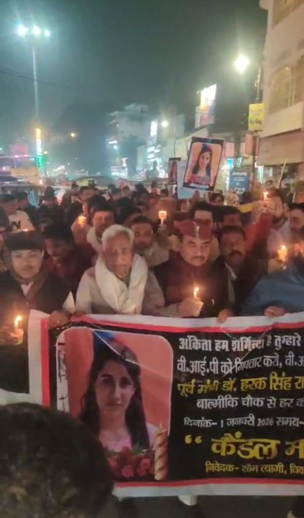 सितम्बर 2022 में हुए अंकिता भंडारी हत्याकांड में वीआईपी का नाम सामने आने के बाद मैदान से लेकर पहाड़ तक के आमजन द्वारा हत्याकांड की सीबीआई जांच और दोषी भाजपा नेताओं की गिरफ्तारी और उनकी फांसी की मांग न केवल स्थानीय प्रदर्शन तक सीमित है बल्कि यह एक जन आंदोलन बन चुका है। इस क्रम में साल के पहले दिन कुंभ नगरी हरिद्वार में वरिष्ठ कांग्रेस नेता सोम त्यागी और कांग्रेस ब्लॉक अध्यक्ष विकास चंद्रा के संयोजन में बाल्मीकि चौक से लेकर हर की पैड़ी तक अंकिता भंडारी हत्याकांड की सीबीआई जांच और दोषी भाजपा नेताओं की तत्काल गिरफ्तारी की मांग को लेकर कैंडल मार्च निकाला गया, जिसमें हरिद्वार की सड़कों हाथ में मोमबत्ती लिए भारी हुजूम उमड़ पड़ा और जमकर धामी सरकार और भाजपा के खिलाफ नारेबाजी की। कैंडल मार्च का नेतृत्व प्रदेश के पूर्व मंत्री डॉ हरक सिंह रावत ने किया।