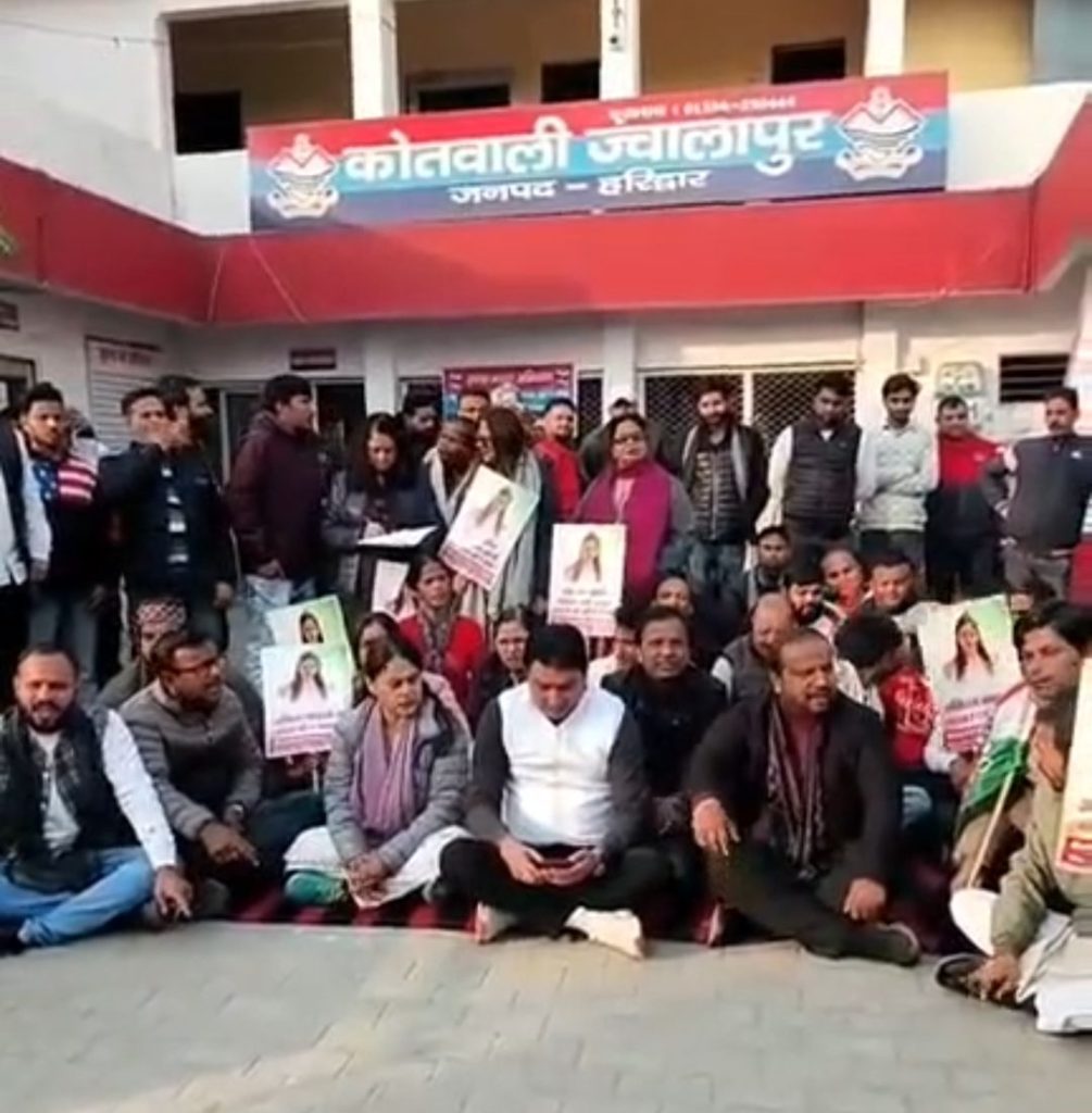 धरना प्रदर्शन को संबोधित करते हुए महानगर अध्यक्ष अमन गर्ग और वरिष्ठ नेता वरुण बालियान ने कहा कि कैबिनेट मंत्री रेखा आर्य के पति द्वारा बिहारी मूल की महिलाओं के लिए की गई अभद्र टिप्पणी निंदनीय है और यह महिलाओं के सम्मान पर सीधा हमला है। उन्होंने कहा कि कांग्रेस पार्टी महिलाओं के अपमान को किसी भी सूरत में बर्दाश्त नहीं करेगी। इसी मांग को लेकर आज ज्वालापुर कोतवाली में लिखित पत्र देकर मुकदमा दर्ज करने की मांग की गई है। महिला कांग्रेस जिला अध्यक्ष अंजू मिश्रा, शहर अध्यक्ष लता जोशी ने कहा कि महिलाओं के सम्मान से खिलवाड़ करने वालों पर सख्त कानूनी कार्रवाई होनी चाहिए। कांग्रेस ने चेतावनी दी कि मांगें पूरी न होने पर आंदोलन और तेज किया जाएगा। वरिष्ठ नेता मुरली मनोहर ने कहा कि अंकिता भंडारी हत्याकांड में अब तक न्याय नहीं मिलना सरकार की विफलता को दर्शाता है। वहीं सरकार में कैबिनेट मंत्री का पद प्राप्त महिला नेत्री के पति द्वारा महिलाओं के प्रति अशोभनीय भाषा का प्रयोग भाजपा के लोगों की मानसिकता को दर्शाता है। वरिष्ठ नेता इरफान अंसारी ने कहा कि जनता का भरोसा तभी बहाल होगा जब अंकिता हत्याकांड की निष्पक्ष जांच होगी। यूथ कांग्रेस जिलाध्यक्ष कैश खुराना, यूथ कांग्रेस अध्यक्ष तुषार कपूर ने कहा कि युवा वर्ग पीड़िता को न्याय दिलाने की इस लड़ाई में पीछे नहीं हटेगा। पार्षद विवेक भूषण विक्की, सुनील कुमार ने कहा कि भाजपा राज में महिलाएं सुरक्षित नहीं है। मंत्री के पति मंच से महिलाओं के लिए गलत प्रकार की भाषा का प्रयोग करते हैं। इस दौरान याज्ञिक वर्मा, सुनील प्रजापति,रचना शर्मा, शशि झा, नलिनी दीक्षित, सईदा कुरैशी, अंजू द्विवेदी, पार्षद प्रतिनिधि शहाबुद्दीन अंसारी,अकरम अंसारी, मयंक सिंह, पूर्व पार्षद इसरार अहमद,रियाज अंसारी,अयान सैफी, मंजू रानी, हिमांशु राजपूत, सुनील प्रजापति,ऋषभ वशिष्ठ, कैलाश प्रधान, अमित चंचल,रेखा गुप्ता, मयंक त्यागी, रोहित नेगी,प्रीतम बर्मन,प्रदीप कुमार,आरिफ , जावेद खान, अज्जू खान,दिनेश वालिया,मोनिक धवन,इदरीश,इदरीश मंसूरी, कपिल तोमर, साजिद, अंकुश धीमान,मोनू धीमान, अंकित चौधरी,इलमास, शक्ति आदि कांग्रेस जन उपस्थित रहे।