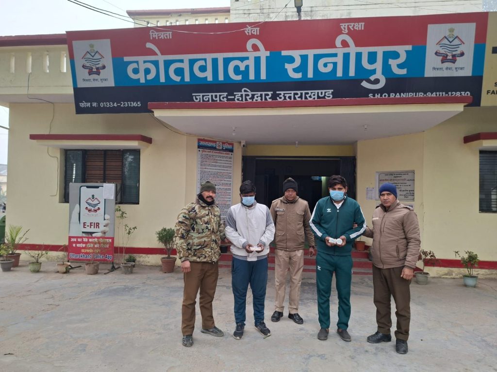 कोतवाली रानीपुर पुलिस ने दो तस्करों को गिरफ्तार कर एक लाख रूपए से अधिक कीमत की स्मैक बरामद की है। अलग-अलग स्थान से गिरफ्तार किए गए आरोपियों के कब्जे से 9 ग्राम व 5.30 ग्राम स्मैक बरामद हुई है। आरोपियों के खिलाफ एनडीपीएस एक्ट के तहत मुकद्मा दर्ज किया गया है। एसएसपी के निर्देश पर नशा तस्करों के खिलाफ चलाए जा रहे अभियान के तहत कोतवाली पुलिस की गैस प्लांट चौकी टीम ने छापेमारी कर गैस प्लान्ट क्षेत्रान्तर्गत स्थित विजन मेटल फैक्ट्री के पास खाली मैदान से आरोपी संतोष सिह पुत्र शिव करन सिंह राठोर निवासी नवोदय नगर नियर शिव मंदिर पीठ बाजार थाना सिडकुल को 90 हजार रूपए कीमत की स्मैक समेत दबोच लिया। उसके कब्जे से स्मैक बेचकर कमाए 1500 रूपए भी पुलिस ने बरामद किए है। इसके अलावा सुमननगर चौकी पुलिस टीम रोड नं.3 सुमननगर से आरोपी मंगत दास पुत्र देशराज निवासी राज मेडिकल के पास अम्बेडकर चौक रामधाम थाना सिडकुल को गिरफ्तार कर 55 हजार रूपए कीमत की स्मैक बरामद की।