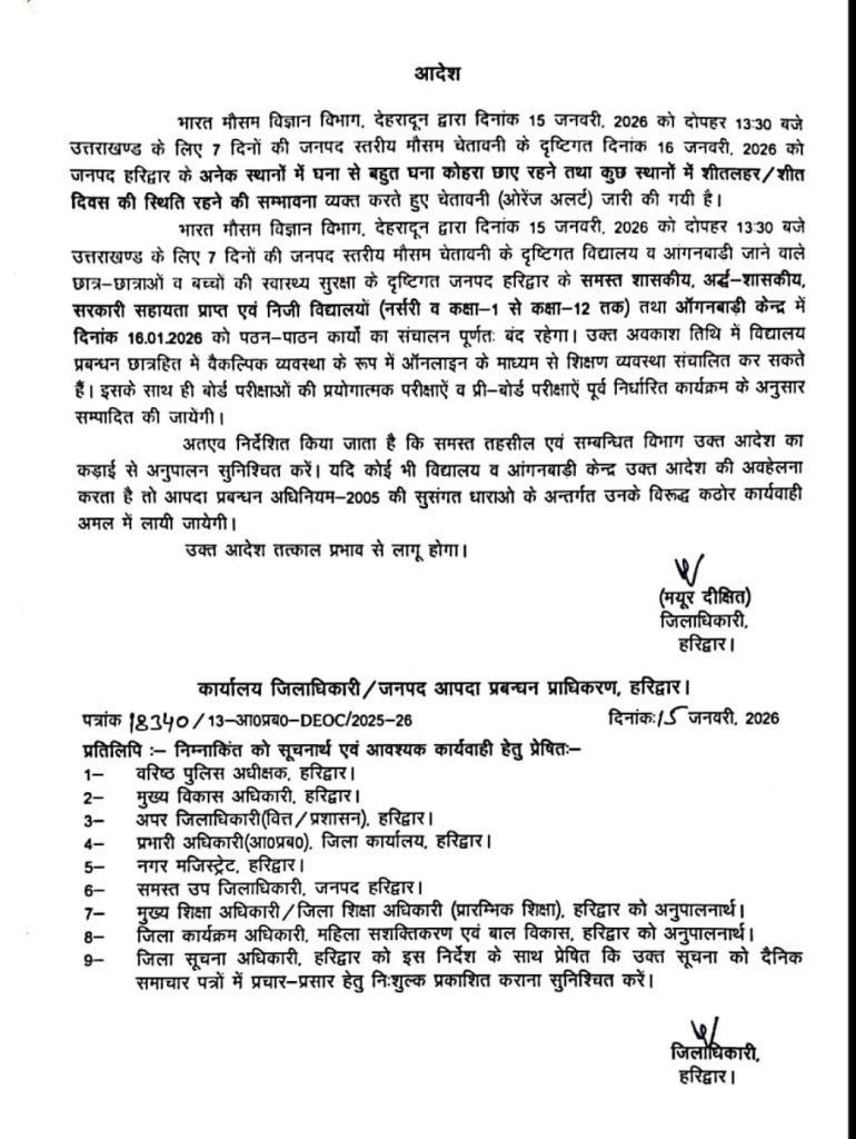 भारत मौसम विज्ञान विभाग, देहरादून द्वारा दिनांक 15 जनवरी, 2026 को दोपहर 13:30 बजे उत्तराखण्ड के लिए 7 दिनों की जनपद स्तरीय मौसम चेतावनी के दृष्टिगत विद्यालय व आंगनबाड़ी जाने वाले छात्र-छात्राओं व बच्चों की स्वास्थ्य सुरक्षा के दृष्टिगत जनपद हरिद्वार के समस्त शासकीय, अर्द्ध-शासकीय, सरकारी सहायता प्राप्त एवं निजी विद्यालयों (नर्सरी व कक्षा-1 से कक्षा-12 तक) तथा ऑगनबाड़ी केन्द्र में दिनांक 16.01.2026 को पठन-पाठन कार्यों का संचालन पूर्णतः बंद रहेगा। उक्त अवकाश तिथि में विद्यालय प्रबन्धन छात्रहित में वैकल्पिक व्यवस्था के रूप में ऑनलाइन के माध्यम से शिक्षण व्यवस्था संचालित कर सकते हैं। इसके साथ ही बोर्ड परीक्षाओं की प्रयोगात्मक परीक्षाऐं व प्री-बोर्ड परीक्षाऐं पूर्व निर्धारित कार्यक्रम के अनुसार सम्पादित की जायेंगी।