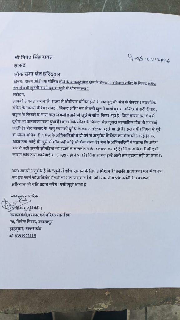 हरिद्वार। भेल क्षेत्र में खुले मे शौच होने की शिकायत पिछले 2 वर्षों से करते आ रहे है। और तहसील दिवस से लेकर जिलाधिकारी के जनसुनवाई कार्यक्रम तक उक्त शिकायत की गई पर नतीजा शून्य रहा हैं। विवश होकर समाजसेवी डॉ हिमांशु द्विवेदी ने हरिद्वार के सांसद त्रिवेंद्र सिंह रावत से कहा कि राज्य में ओडीएफ लागू है उसके बावजूद भी भेल क्षेत्र समेत आस पास के ग्रामीण क्षेत्रों में आज भी लोग खुले में शौच कर रहे हैं। जो कि राज्य के लिए एक अभिशाप है। भेल क्षेत्र के जो लोग खुले में शौच कर रहे हैं, वह सेक्टर 1 बैरियर नंबर 1 रविदास मंदिर के सामने अवैध रूप से झुग्गी झोपड़ी बनाकर वर्षो से रह रहे हैं उन लोगो को भेल प्रबंधन शौचालय की व्यवस्था नहीं कर सकता। क्योंकि वे लोग भेल की भूमि पर अवैध रूप से बसे हुए हैं । वहीं भेल के अधिकारियों ने बताया कि झुग्गी झोपड़ी हटाने में कुछ माननीय भी अवरोध पैदा कर रहे हैं । जिस कारण उन्हे हटाने मे रुकावट आ रही है पत्र में श्री द्विवेदी ने इस सामाजिक अभिशाप को अभिलंब दूर करने की मांग की है। ताकि प्रधानमंत्री के स्वच्छ भारत अभियान को बल मिल सके।