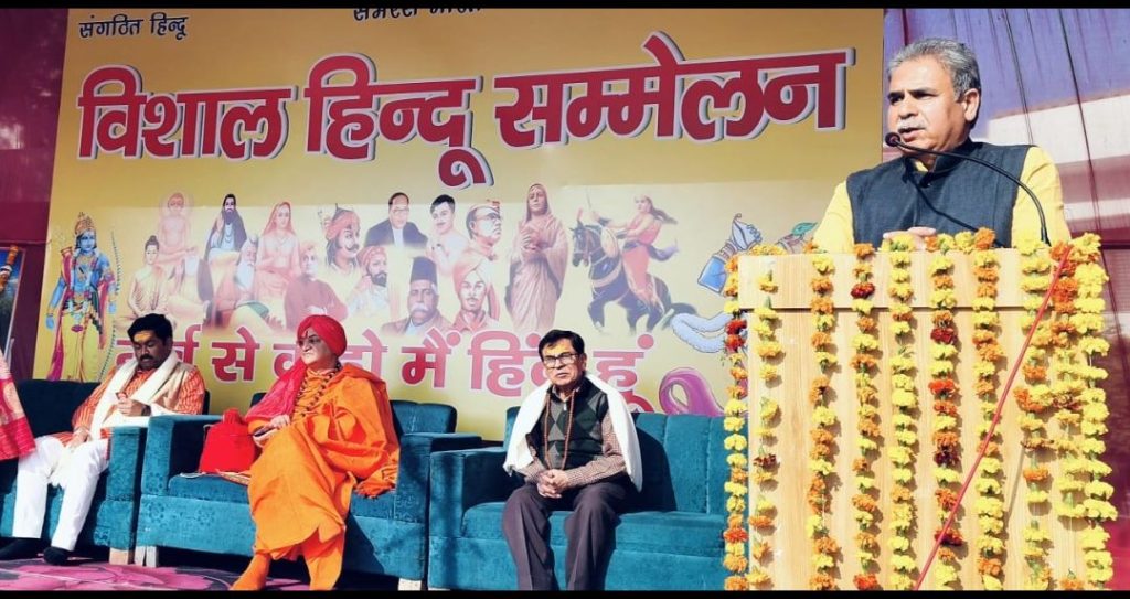 उन्होंने कहा कि समाज में जब-जब कुरीतियां बढ़ीं, तब संतों ने आगे आकर नेतृत्व संभाला। इसी क्रम में दयानंद सरस्वती ने सनातन धर्म में व्याप्त कुरीतियों पर प्रहार करते हुए समाज सुधार का व्यापक अभियान चलाया और हिंदू समाज को नई दिशा दी। आगे जब देश में संस्कारों का क्षरण दिखाई दिया, तब एक सामान्य परिवार में जन्मे नरेंद्र ने संन्यास लेकर स्वामी विवेकानंद के रूप में विश्व मंच पर भारतीय संस्कृति का परचम लहराया और युवा शक्ति को आत्मगौरव का संदेश दिया। वक्त डॉ. आशिमा शर्मा ने कहा कि वक्ता ने कहा कि राष्ट्र निर्माण का मार्ग हमारी संस्कृति से होकर गुजरता है। हिंदू धर्म सम्मेलन केवल आयोजन नहीं, बल्कि अपनी जड़ों की ओर लौटने का प्रयास है। उन्होंने कहा कि आज पश्चिमी प्रभाव के कारण हम अपनी ही परंपराओं को भूलते जा रहे हैं। राजनीतिक आजादी तो मिल गई, लेकिन विचारों की आजादी अभी अधूरी है। उन्होंने पांच परिवर्तन को भारत के पुनरुत्थान का संकल्प बताया। कहा कि सबसे बड़ा संकट बाहरी नहीं, बल्कि घर के भीतर है। तकनीक और सुविधाएं बढ़ीं, पर संस्कार कमजोर हुए। संयुक्त परिवार टूट रहे हैं, संवाद की जगह आभासी दुनिया ने ले ली है। वक्ता ने आह्वान किया कि हर घर को संस्कारों का गुरुकुल बनाया जाए और स्वतंत्रता की सही परिभाषा समझी जाए। वक्ता डॉ. दयाशंकर विद्यालंकार ने विचार रखे। संचालन अधिवक्ता राजकुमार और संजीव बाली ने संयुक्त रूप से किया।