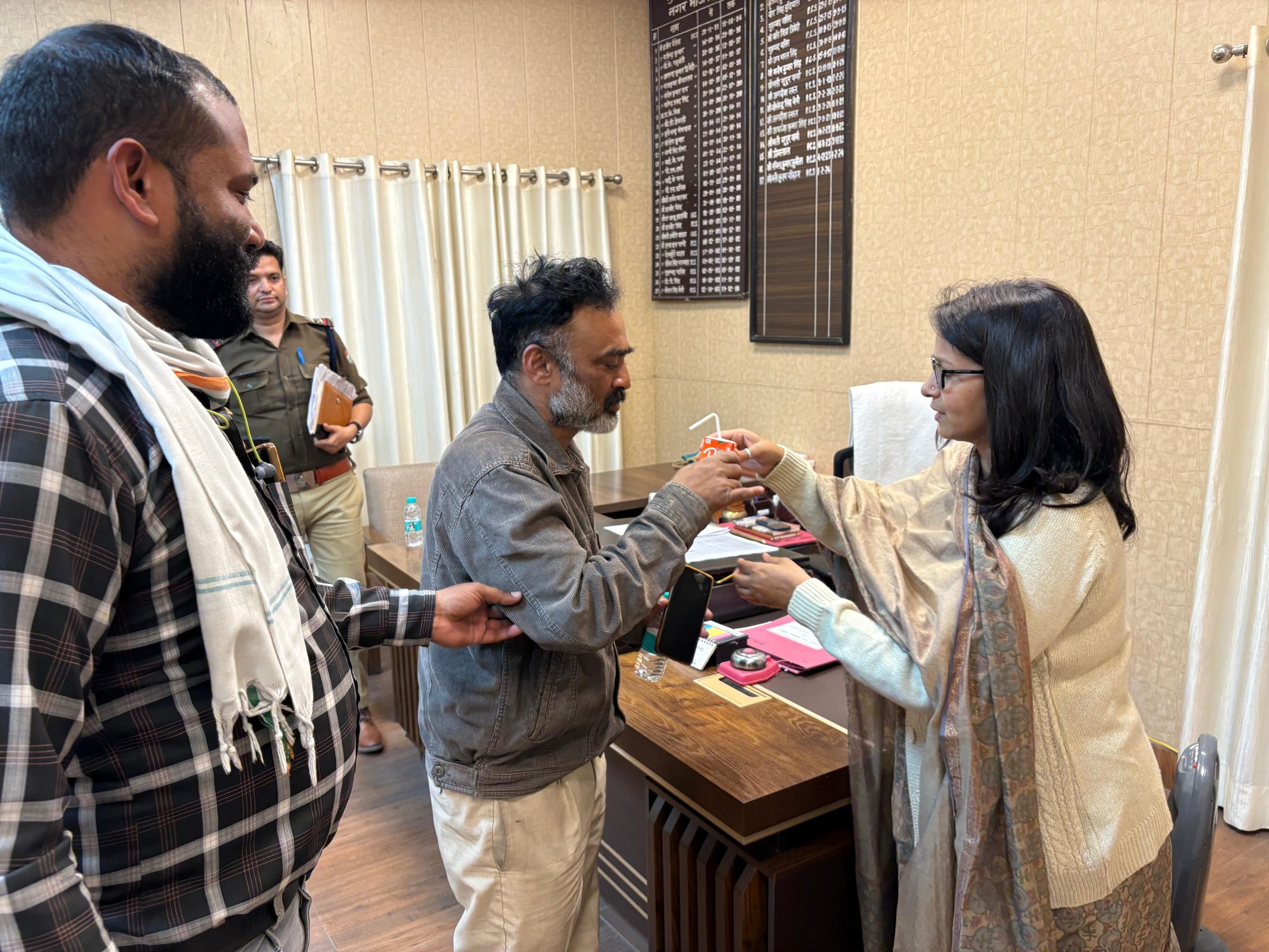 जोमेटो फूड डिलीवर कम्पनी के डिलीवरी बॉय द्वारा जोमेटो कम्पनी द्वारा निर्धारित समय पर डिलीवरी न देने पर डिलीवरी बॉय के प्वाइंट तथा वेतन की कटौती न किये जाने तथा वेतन बढ़ाये जाने सम्बन्धी आदि मांगों को लेकर जोमेटो फूड डिलीवरी बॉय / कार्मिकों द्वारा रानीपुर मोड़, हरिद्वार पर 3 दिन से अनशन किया जा रहा है, जिसके सम्बन्ध में आज दिनांक 26.02.2026 को नगर मजिस्ट्रेट हरिद्वार श्री कुश्म चौहान द्वारा जोमेटो कम्पनी के पदाधिकारियों एवं अनशनकारियों को कार्यालय नगर मजिस्ट्रेट, हरिद्वार में बुलाकर उनसे वार्ता की गयी तथा नगर मजिस्ट्रेट हरिद्वार द्वारा जोमेटो कम्पनी के कर्मचारियों द्वारा सौंपे गये मांगपत्र पर नियमानुसार कार्यवाही किये जाने हेतु जोमेटो कम्पनी के पदाधिकारियों के साथ वार्ता की गई तथा अनशनकारियों को जूस पिलाकर उनका अनशन समाप्त किया गया।