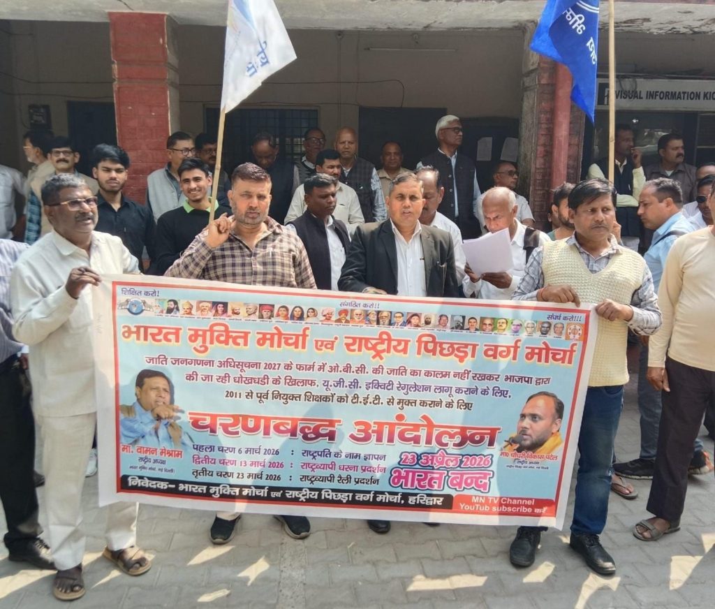 हरिद्वार, बामसेफ, भारत मुक्ति मोर्चा, राष्ट्रीय पिछड़ा वर्ग मोर्चा के राष्ट्रीय अध्यक्ष वामन मेश्राम के आवाह्न पर भारत मुक्ति मोर्चा एवं राष्ट्रीय पिछड़ा वर्ग मोर्चा बामसेफ के ऑफसूट्स संगठनों के कार्यकर्ताओं ने इक्विटी रेगुलेशन यूजीसी बिल लागू करने व ओबीसी जाति आधारित जनगणना करने 2011 में नियुक्त शिक्षकों को टी ई टी से मुक्त करने को लेकर पूरे देश में राष्ट्रव्यापी आंदोलन के प्रथम चरण में आज हरिद्वार में प्रदर्शन किया गया। पहले चरण के प्रदर्शन को संबोधित करते हुए भंवर सिंह ,भानपाल रवि ,राजेंद्र श्रमिक ने कहा कि 1931-32 के बाद से अभी तक ओबीसी समाज की जाति आधारित जनगणना नहीं की गई है जिससे ओबीसी समाज को जो भागीदारी का लाभ मिलना चाहिए था वह नहीं मिला,अभी हाल ही में माननीय न्यायालय के आदेश पर भारत सरकार द्वारा इक्वलिटी रेगुलेशन, यूजीसी बिल लागू किया गया था बिल इसलिए लागू किया गया था कि एससी एसटी ओबीसी समाज के बच्चे भारत के उच्च शिक्षण संस्थानों में पढ़ने जाते थे उनके साथ जातिगत भेदभाव किया जाता रहा है भेदभाव से प्रताड़ित करने की वजह से हमारे कई होनहार बच्चों ,बच्चियों ने खुदकुशी कर कर अपनी जान दे दी , इन सभी पहलुओं को देखते हुए माननीय उच्चतम न्यायालय द्वारा सभी संस्थाओं को कमेटी बनाकर भेदभाव को रोकने के लिए सरकार को निर्देशित किया था जो एक अच्छी पहल थी परंतु कुछ मुट्ठी भर मनुवादी सोच रखने वाले लोगों के द्वारा यूजीसी बिल का विरोध किया गया और हमारे समाज के खिलाफ माननीय उच्च न्यायालय में वाद दायर कर यूजीसी कानून पर स्टे करा दिया गया जिसको लेकर पूरे देश में एससी एसटी ओबीसी माइनॉरिटी के कार्यकर्ताओं ने विरोध प्रदर्शन किया इसी क्रम में आज बामसेफ के आफ सूट संगठन के मुख्य कार्यकर्ताओं जिसमें एससी एसटी ओबीसी समाज इकट्ठा होकर यूजीसी बिल को लागू करने एवं अपनी जातिगत जनगणना करने के लिए माननीया राष्ट्रपति महोदया को सिटी मजिस्ट्रेट हरिद्वार के माध्यम से ज्ञापन प्रस्तुत किया ज्ञापन प्रस्तुत करने वालों में महिपाल सिंह,नरेश कुमार,जीवन सिंह,सत्यपाल शास्त्री, मनोज कुमार बरछियाल,नसीर अहमद,जयपाल सी.पी.सिंह मनजीत सिंह, अशोक कुमार कटारिया कुंवर पाल मा.रफल सिंह कटारिया,राहुल पास्टर सुरेंद्र कुमार ,डॉ राजकुमार, मास्टर फूल सिंह,सत्यपाल सिंह, राजाराम प्रजापति,शशीकांत सैनी, श्याम सुंदर प्रधान,रमेश चंद, जगपाल सिंह,सलेक् चंद,राजेश खेरवाल,अजय कुमार लोहट,जितेंद्र तेश्वर,एडवोकेट संजय मूलनिवासी, एडवोकेट रूपचंद आजाद,जॉनी कुमार,श्याम सिंह,एडवोकेट रेनू सिंह,संजय कुमार ,कन्हैया,बबीता, शशीकांत सैनी,संजय कुमार सैनी, सुरेश कुमार,कुलदीप, कमल सिंह, आरती,दीपा,बबीता पवार, कमलजीत आदि कार्यकर्ता भारी संख्या म