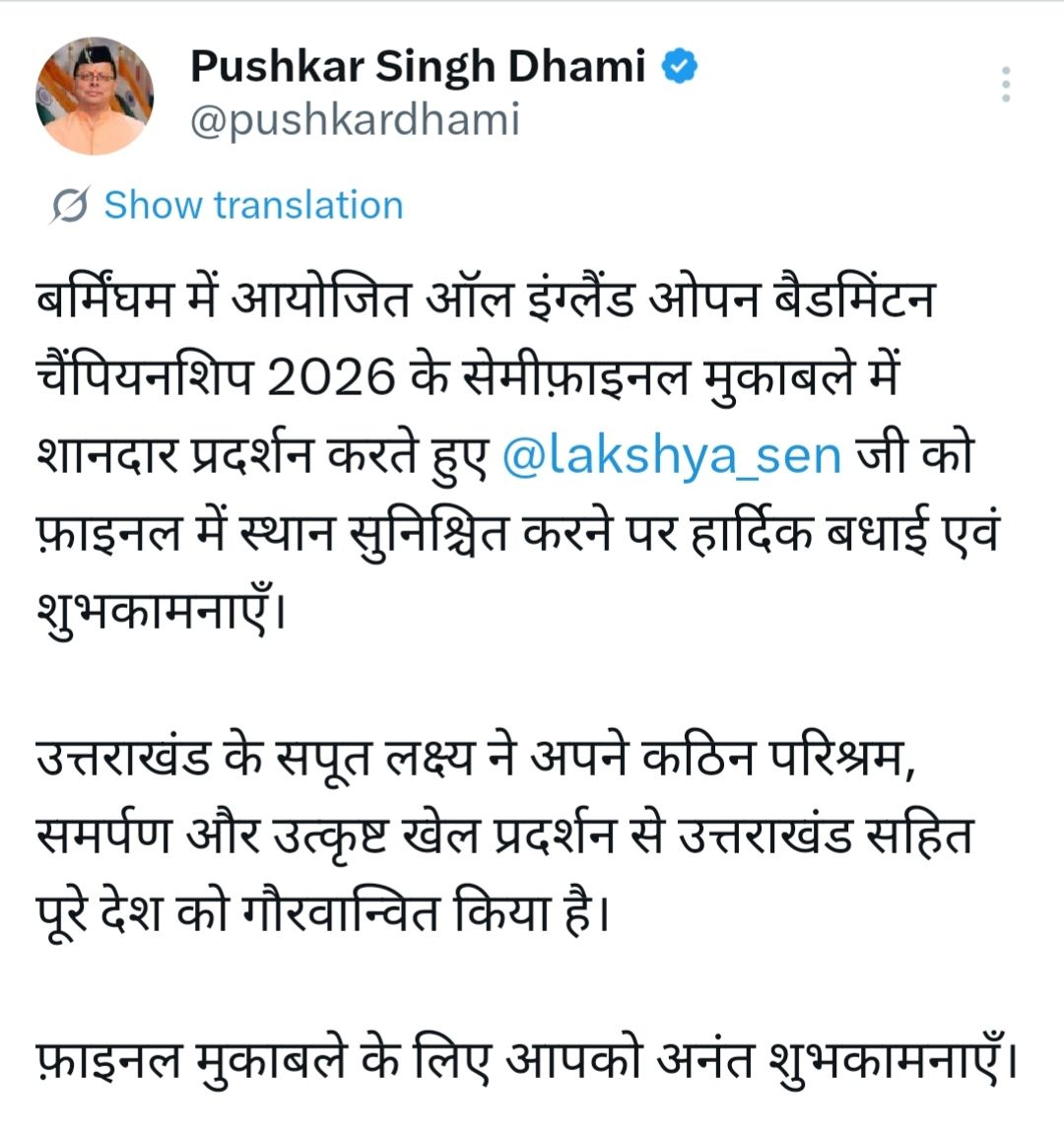 ऑल इंग्लैंड बैडमिंटन फाइनल में फिर पहुंचने पर उत्तराखंड के लक्ष्य सेन को मुख्यमंत्री पुष्कर सिंह धामी ने बधाई और शुभकामनाएं दी हैं।