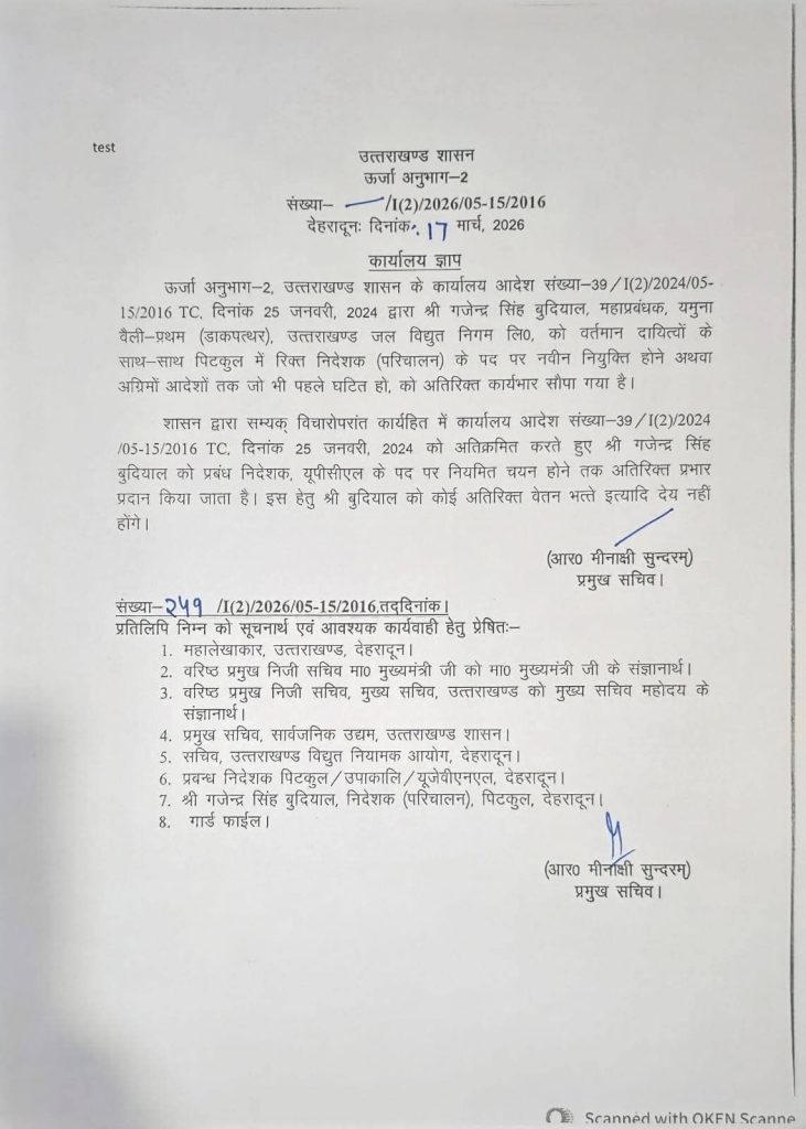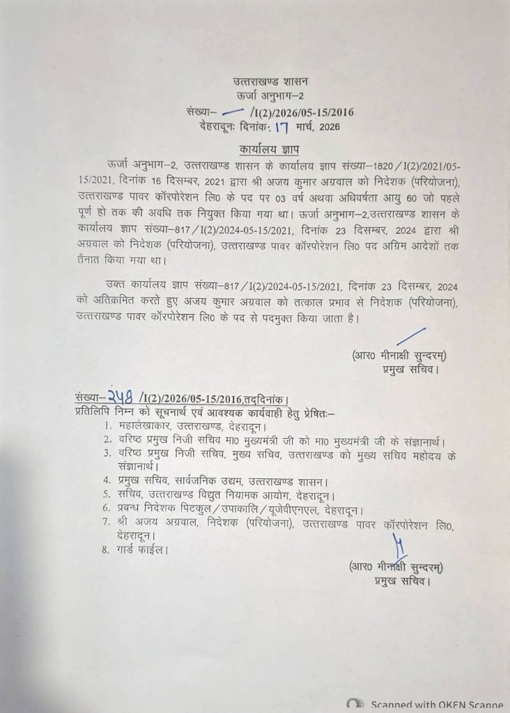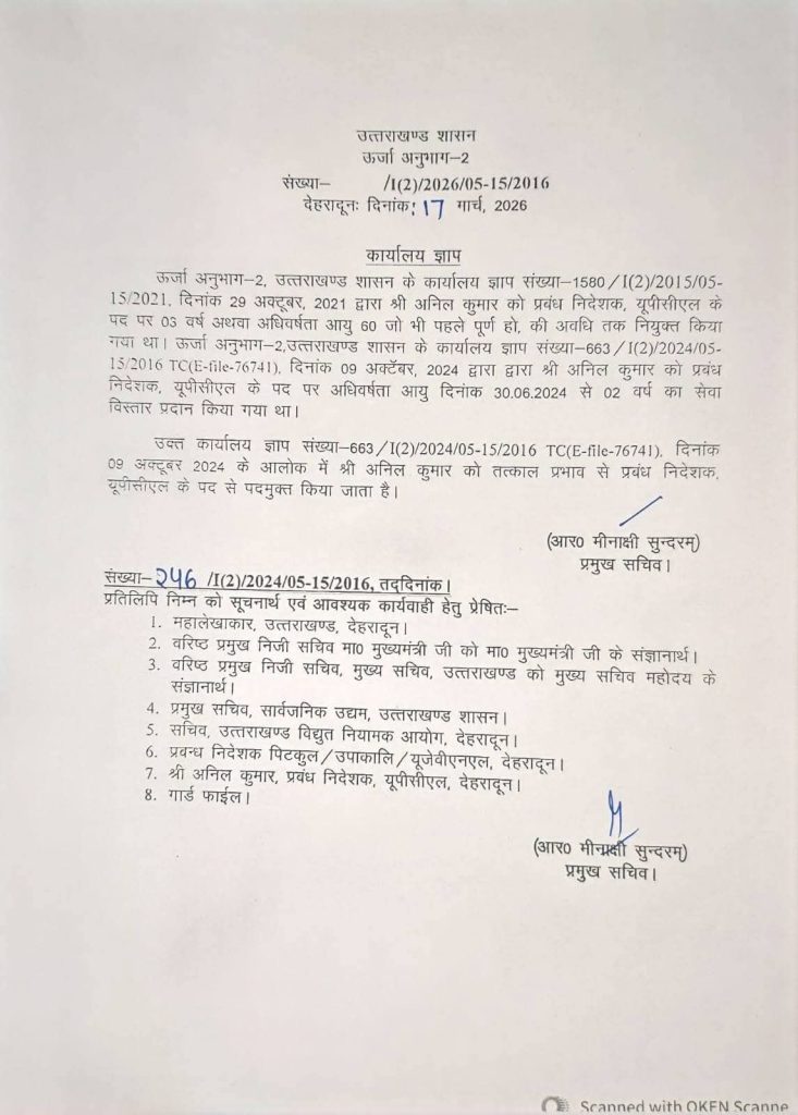 उत्तराखण्ड शासन द्वारा यूपीसीएल एवं यूजेवीएनएल के निम्न प्रमुख पदों पर दिए गए सेवा विस्तार समाप्त करने संबंधी आदेश जारी किए गए।