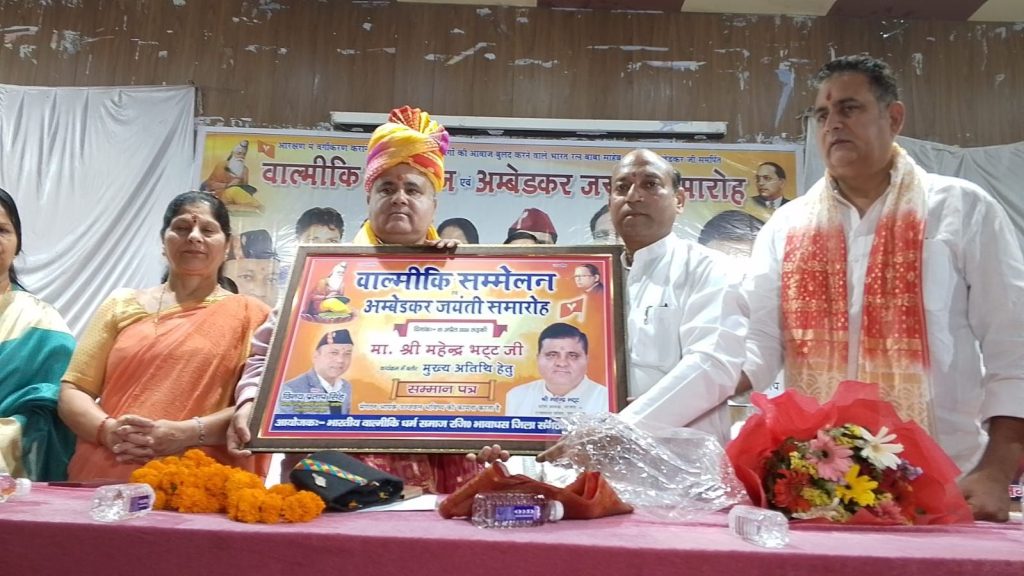 भारतीय वाल्मीकि धर्म समाज द्वारा आज नगर निगम सभागार रुड़की में वाल्मीकि सम्मेलन अंबेडकर जयंती समारोह का आयोजन किया गया जिसमें मुख्य अतिथि भाजपा प्रदेश अध्यक्ष महेंद्र भट्ट ने शिरकत की। इस अवसर पर राज्य सफाई आयोग के सदस्य विनय प्रताप सिंह, जिला पंचायत अध्यक्ष किरण चौधरी, मेयर नगर निगम अनीता अग्रवाल, जिला अध्यक्ष भाजपा मधु सिंह मौजूद रहे। कार्यक्रम में मुख्य अतिथियों द्वारा भगवान वाल्मीकि चित्र पर पुष्प माला अर्पित करते हुएदीप प्रज्वलित कर कार्यक्रम का शुभारंभ किया।